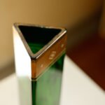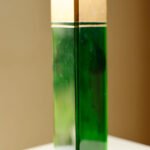 Dunkelgrünes Glas, plan geschliffen; Vasen in Dreiecksform mit Ornamentdekor und Blattfestons in Gold/Blattgold