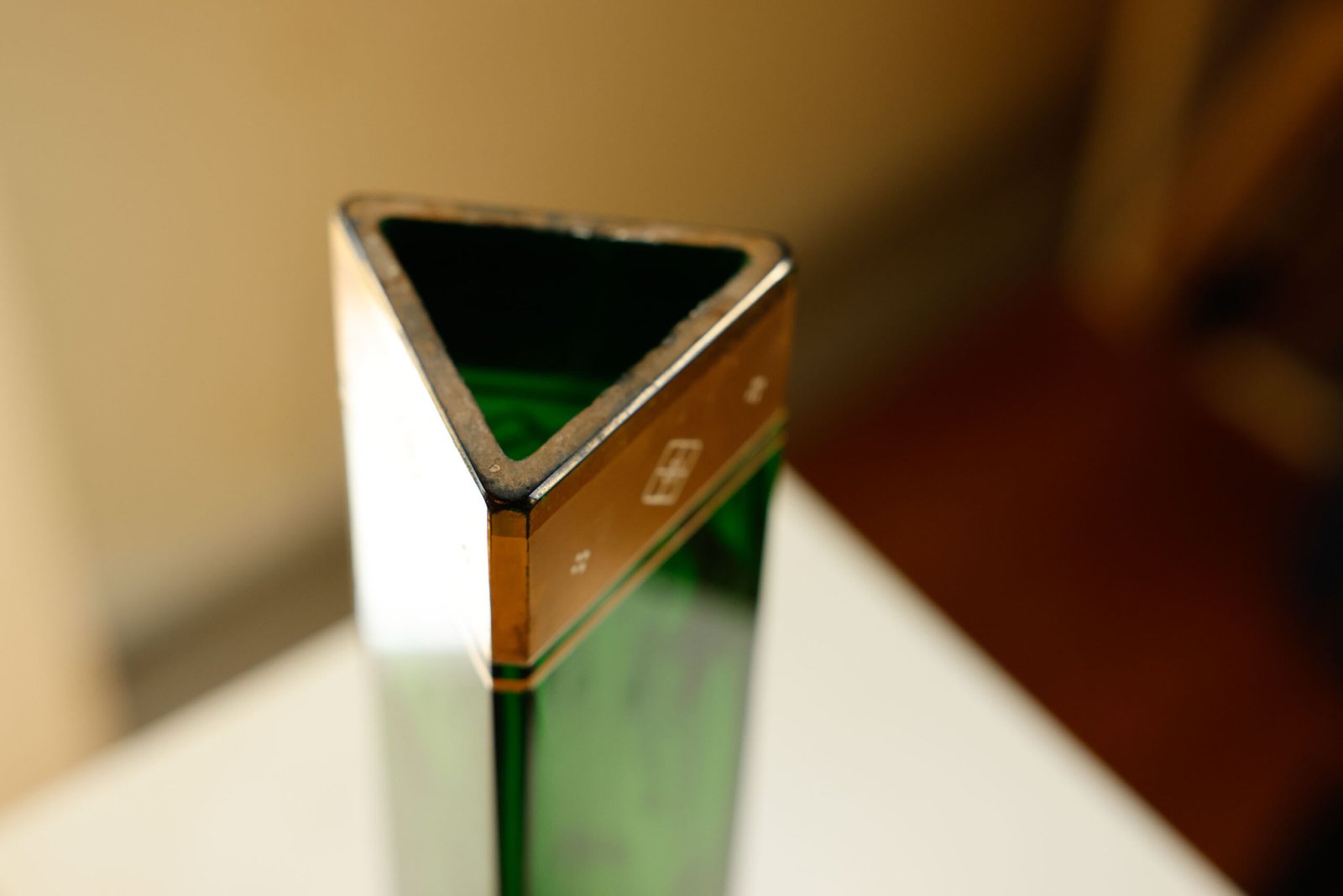 Dunkelgrünes Glas, plan geschliffen; Vasen in Dreiecksform mit Ornamentdekor und Blattfestons in Gold/Blattgold