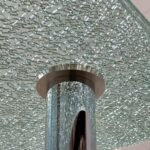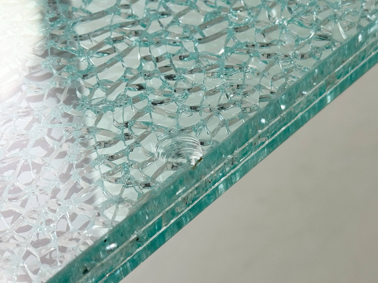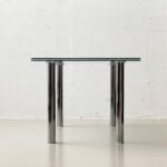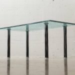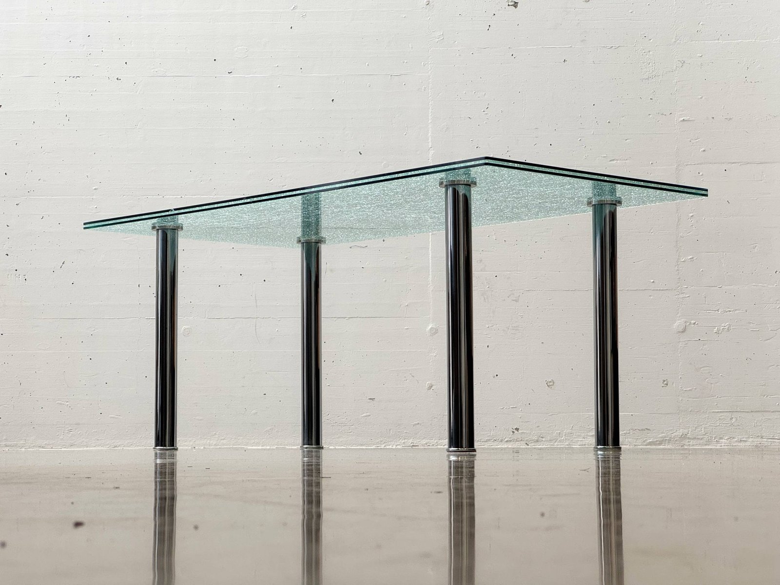Markanter Esstisch mit rechteckiger Tischplatte aus massivem Crashglas, ausgeführt in aufwendig verleimter Mehrschichttechnik. Die charakteristische gebrochene Glasstruktur im Inneren der Platte erzeugt ein spannendes, lichtbrechendes Muster und verleiht dem Tisch eine aussergewöhnliche Tiefenwirkung. Getragen wird die Glasplatte von vier zylindrischen Chromfüssen, welche dem Tisch eine klare, industrielle Anmutung verleihen und einen reizvollen Kontrast zur organischen Struktur des Glases bilden.