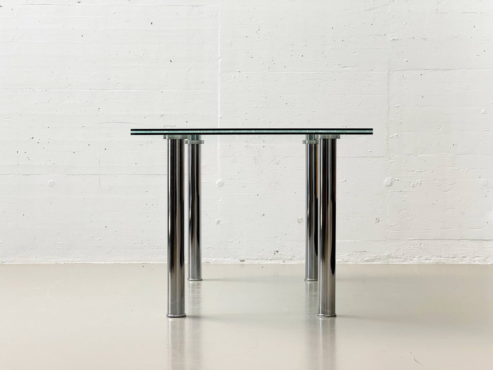 Zustand: Guter Vintage-Zustand mit altersbedingten Gebrauchsspuren. Vereinzelte kleine Kantenbestossungen und minimale Absplitterungen am Glas vorhanden, welche die Stabilität nicht beeinträchtigen. Chromfüsse mit leichten Oberflächenspuren und altersgemässer Patina.
