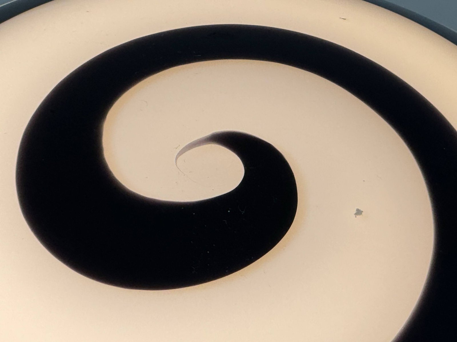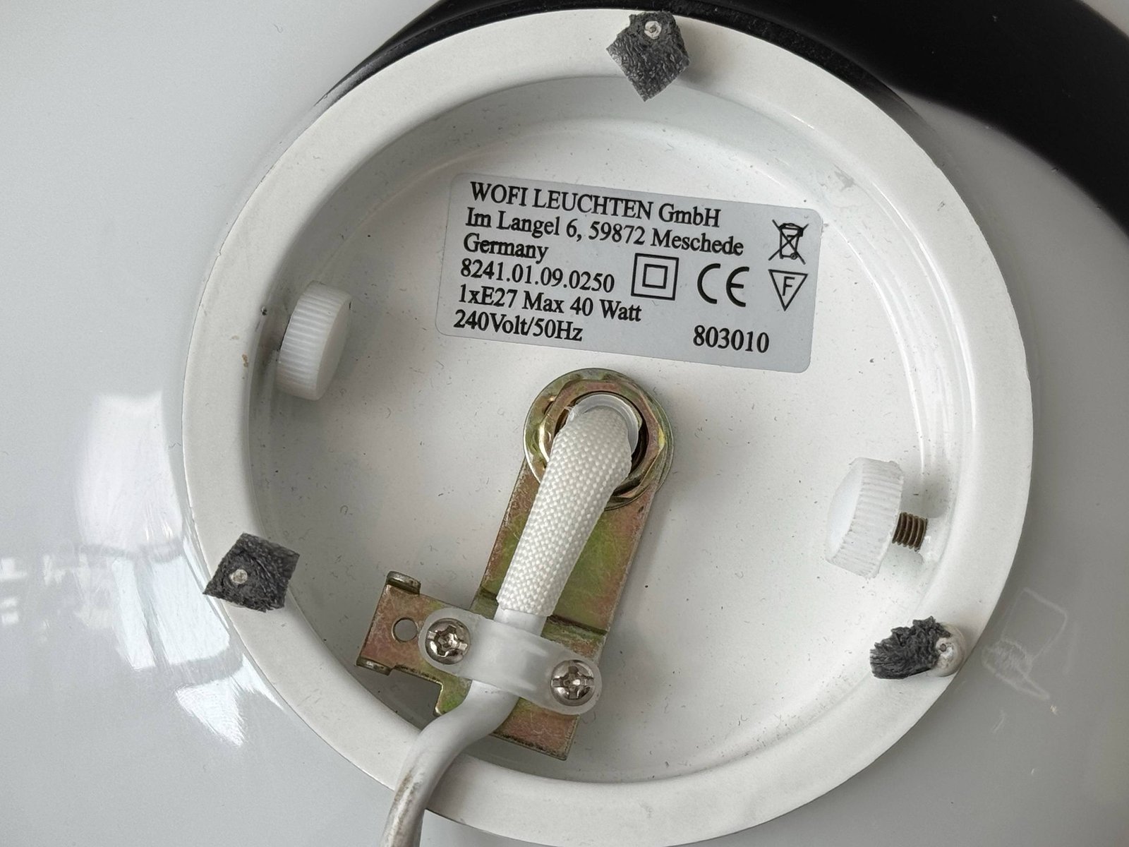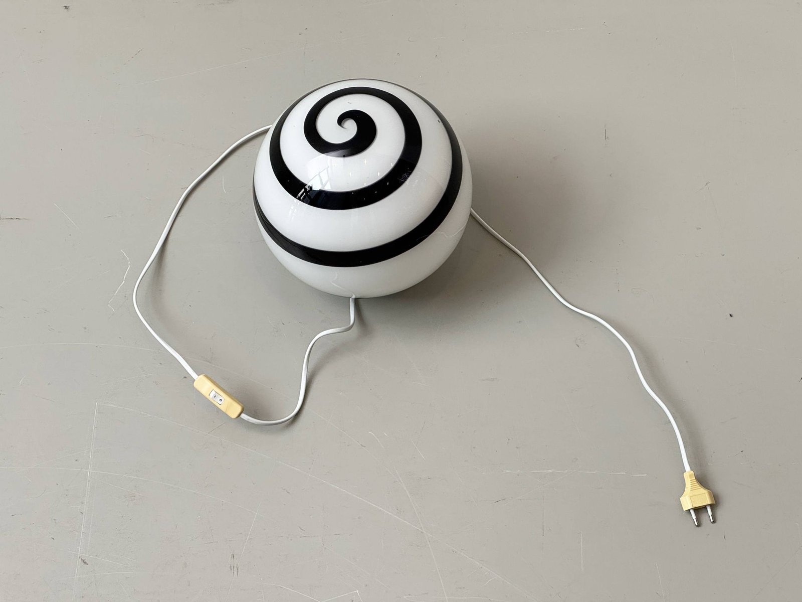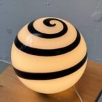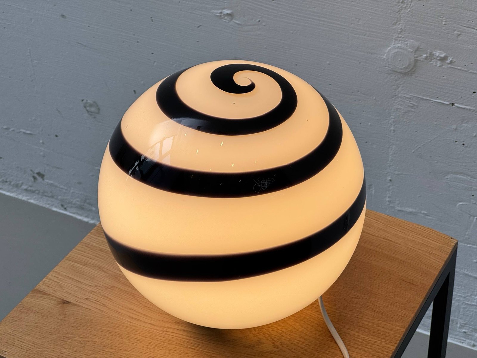 Ausdrucksstarke Bodenleuchte aus Glas des deutschen Herstellers Wofi Leuchten, gefertigt mit charakteristischem schwarz-weissem Wirbel- bzw. Zebra-Dekor. Der grosszügige Glaskorpus sorgt für ein atmosphärisches, weich diffundiertes Licht und verleiht dem Raum eine markante, grafische Präsenz. Durch ihre Dimensionen eignet sich die Leuchte ideal als Bodenleuchte und setzt sowohl in Wohn- als auch in Objektbereichen einen starken Akzent. Das mundgeblasene oder industriell hochwertig gefertigte Glas zeigt ein dynamisches Streifenmuster, das je nach Lichteinfall variiert und die organische Form des Korpus betont. Die Leuchte steht auf einem schlichten Metallfuss, der einen ruhigen Kontrast zur lebhaften Glasstruktur bildet und für sichere Standfestigkeit sorgt.