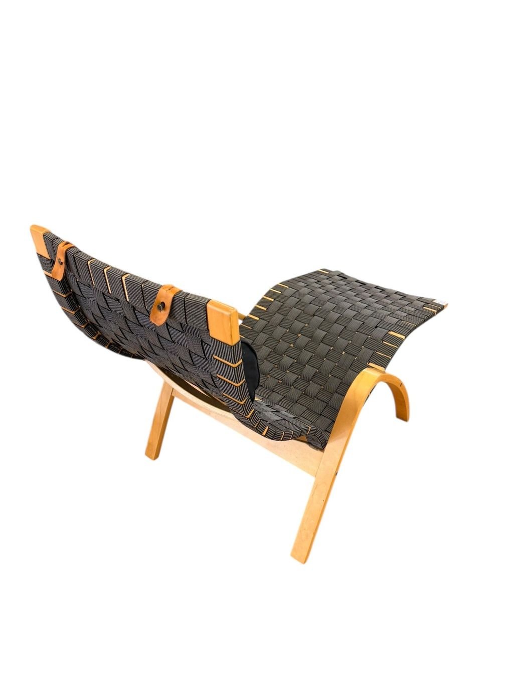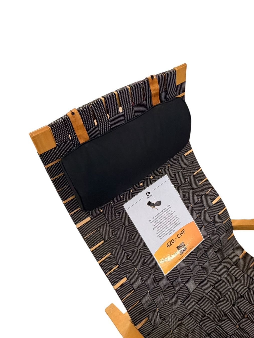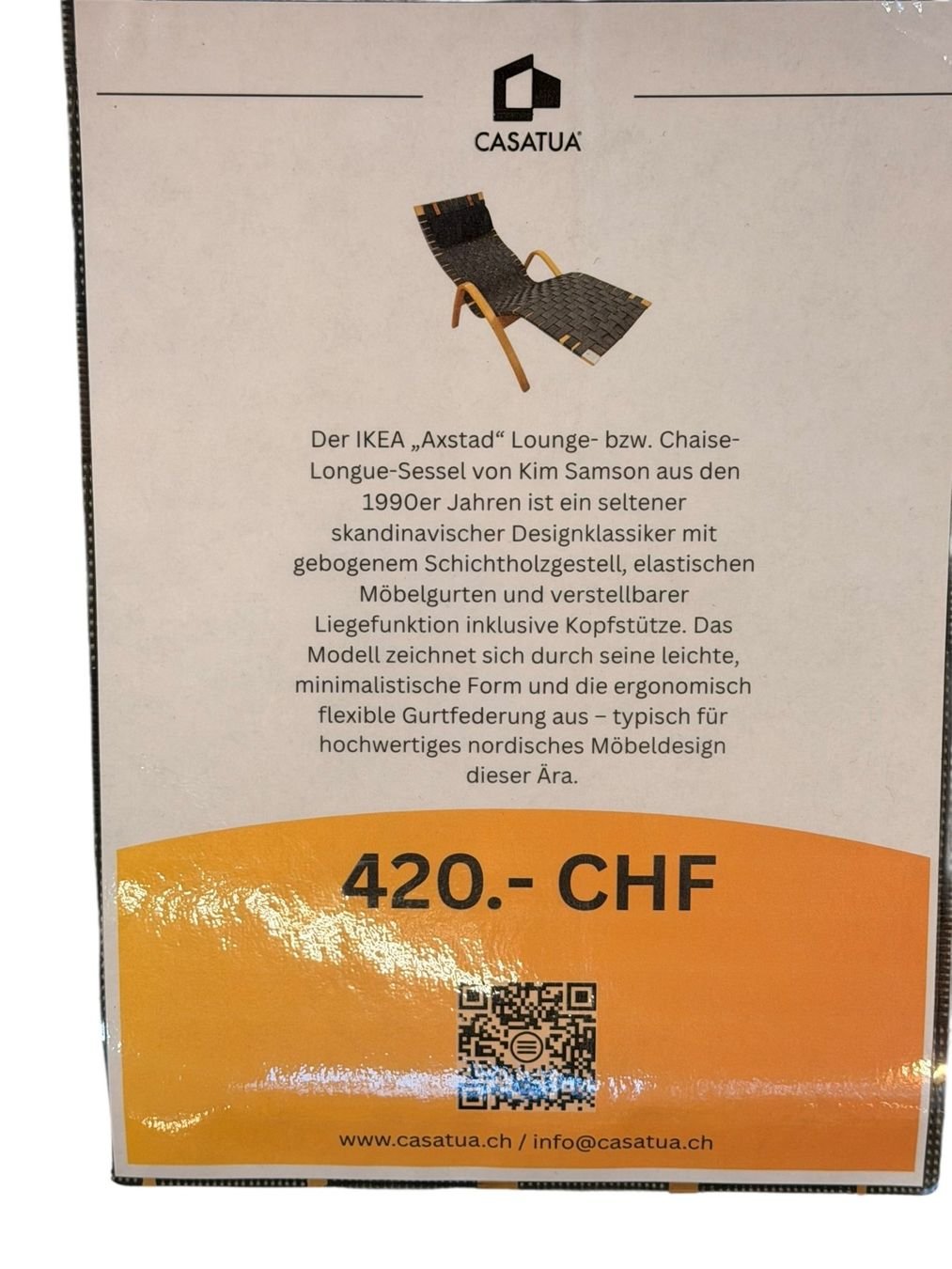 Der IKEA „Axstad“ Lounge- bzw. Chaise- Lounge-Sessel von Kim Samson aus den 1990er Jahren ist ein seltener skandinavischer Designklassiker mit gebogenem Schichtholzgestell, elastischen Möbelgurten und verstellbarer Liegefunktion inklusive Kopfstütze. Das Modell zeichnet sich durch seine leichte, minimalistische Form und die ergonomisch flexible Gurtfederung aus – typisch für hochwertiges nordisches Möbeldesign.