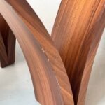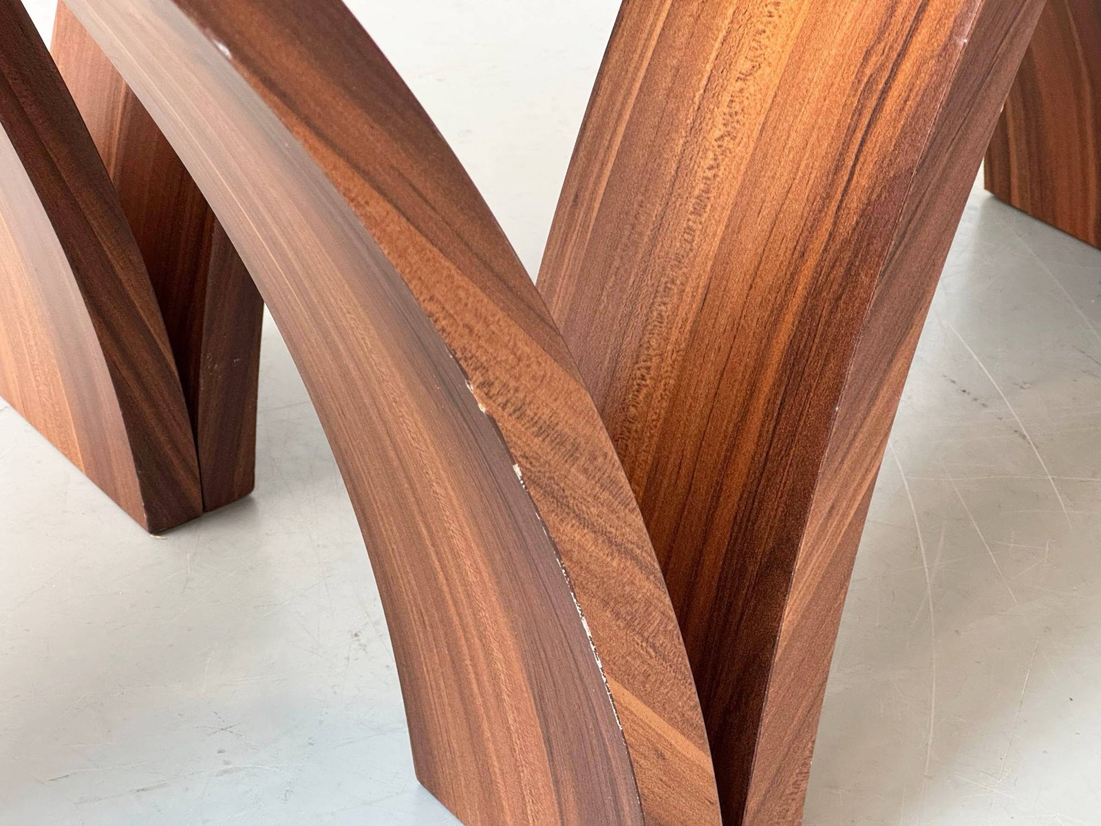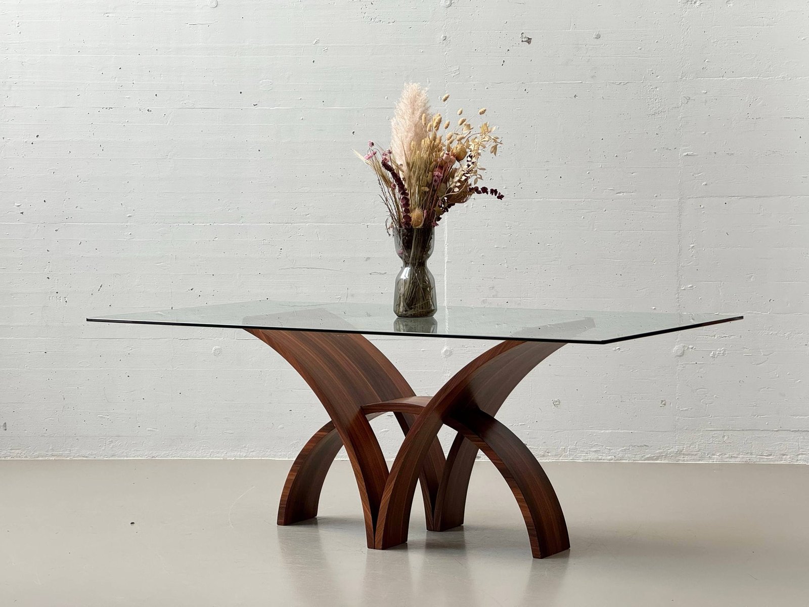Skulpturaler Esstisch mit markanter Glasplatte und aussergewöhnlichem Holzuntergestell aus den 1970er-Jahren. Das Fussgestell besteht aus vier elegant geschwungenen, bogenförmigen Holzelementen, die sich kreuzen und dem Tisch eine architektonische, organische Wirkung verleihen. Die Formensprache erinnert an spätes Mid-Century Modern mit italienischem Einfluss. Die klare Sicherheitsglasplatte (Tempered) liegt auf transparenten Auflagen auf und bildet einen spannenden Kontrast zum warm getönten Holz mit ausdrucksstarker Maserung, Nussbaumfurnier.