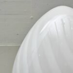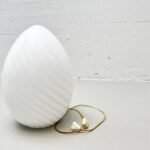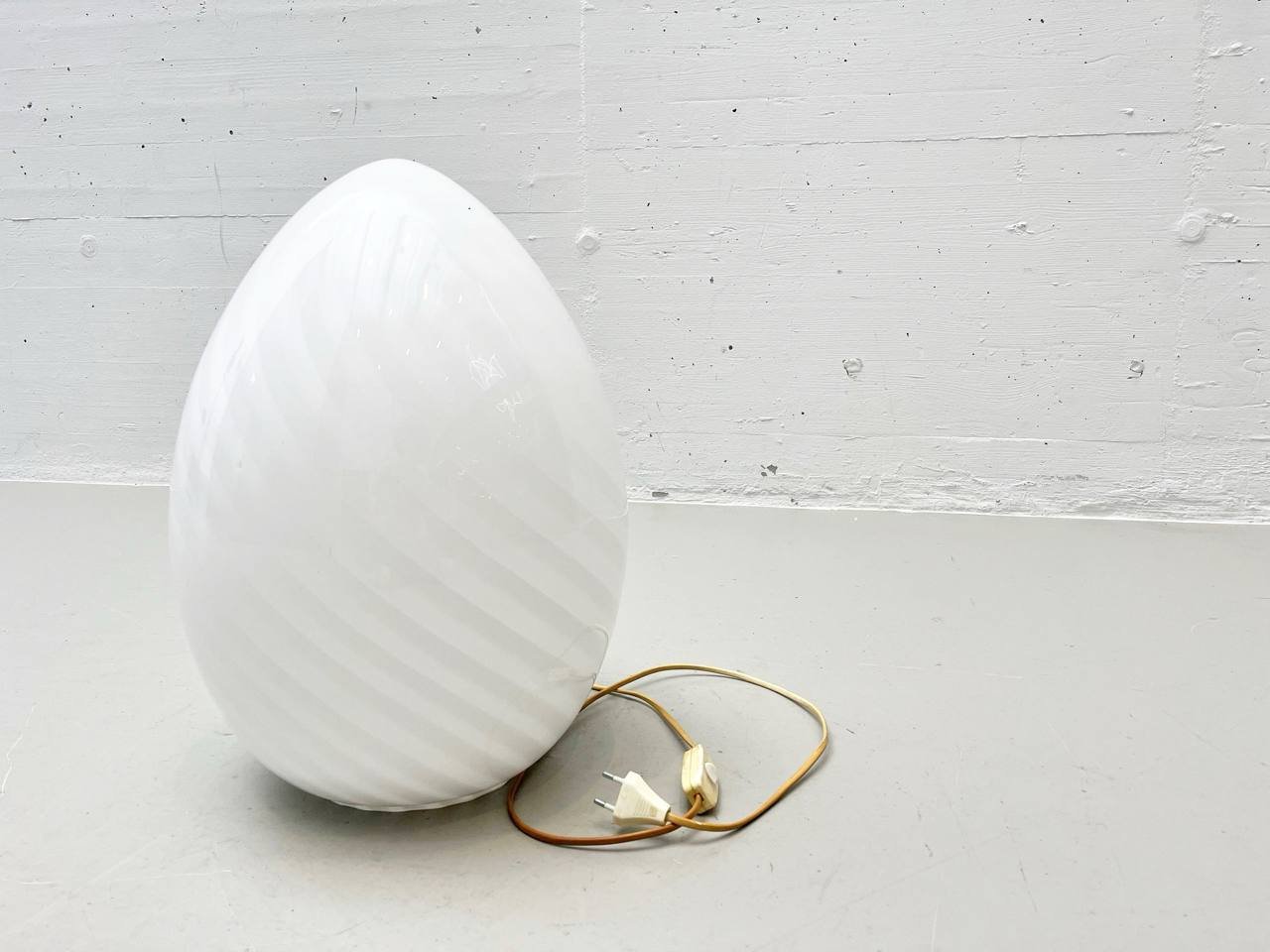 Diese Tischlampe aus Muranoglas besticht durch ihre organische Ei-Form und die handwerkliche Raffinesse der Glasbläserkunst aus Murano, Italien. Das Glas ist in traditioneller Technik gefertigt und zeigt eine elegante, spiralförmige Struktur mit weissen Streifen, die dem Objekt eine lebendige Dynamik verleihen, sobald es beleuchtet ist. Das Licht wird sanft und diffus abgegeben, wodurch die Lampe nicht nur als funktionale Lichtquelle, sondern auch als skulpturales Dekorationsobjekt überzeugt. Die schlichte und zugleich ausdrucksstarke Formensprache entspricht den Entwürfen, wie sie im Umfeld von Venini in den 1960er- bis 1970er-Jahren entwickelt wurden, und ist ein schönes Beispiel für das Zusammenspiel von zeitloser Ästhetik und hoher Glasqualität.