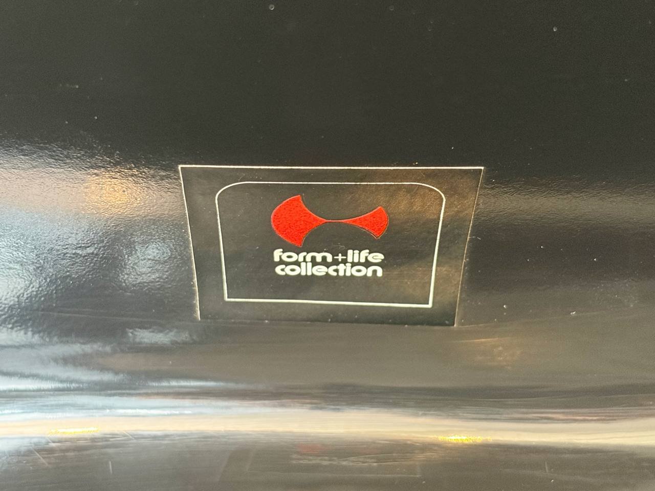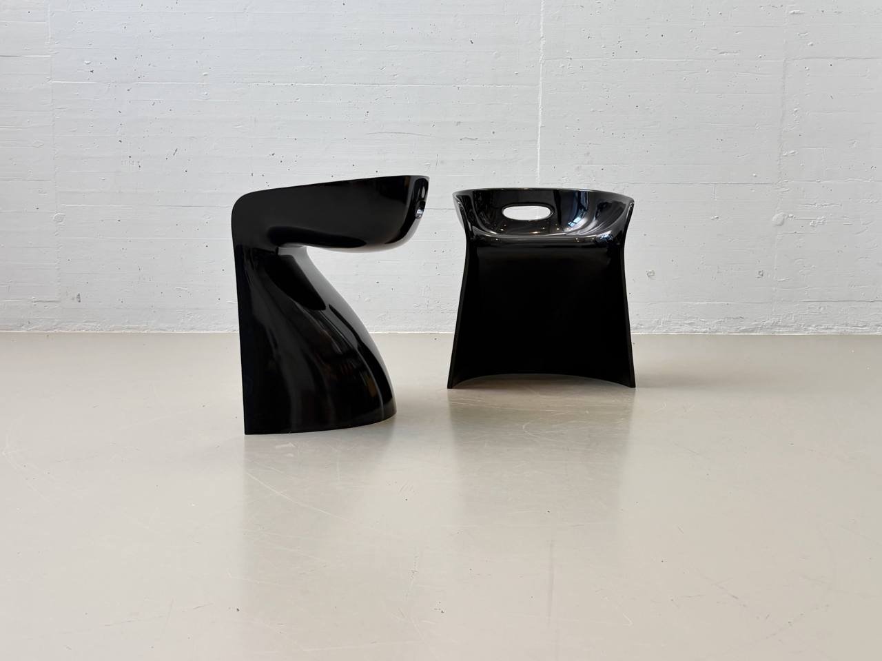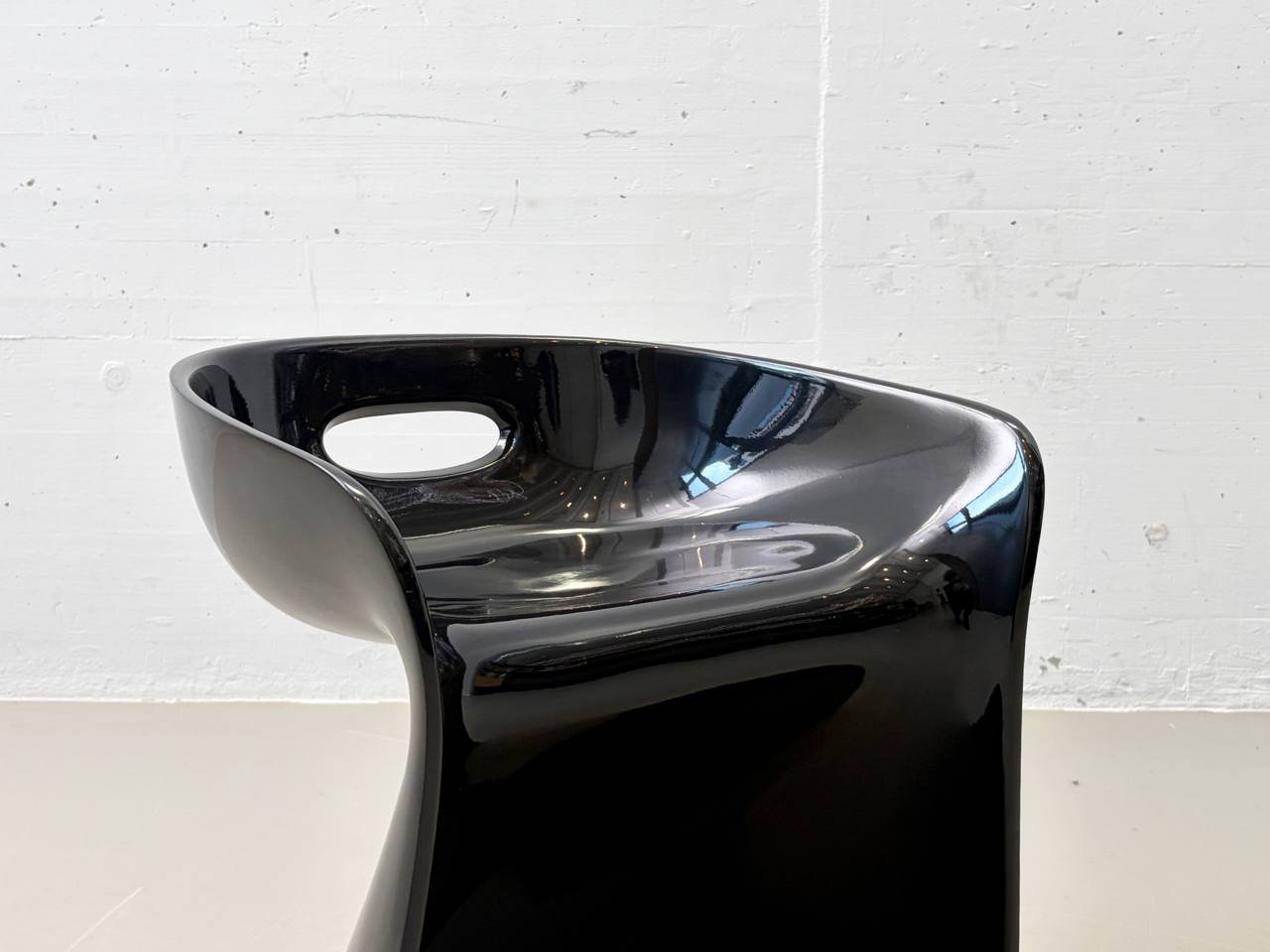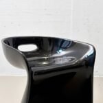 Der Stuhl besteht aus einem Stück schwarz lackiertem Kunststoff und hat einen Griff in der niedrigen Rückenlehne. Ein absoluter Blickfang!