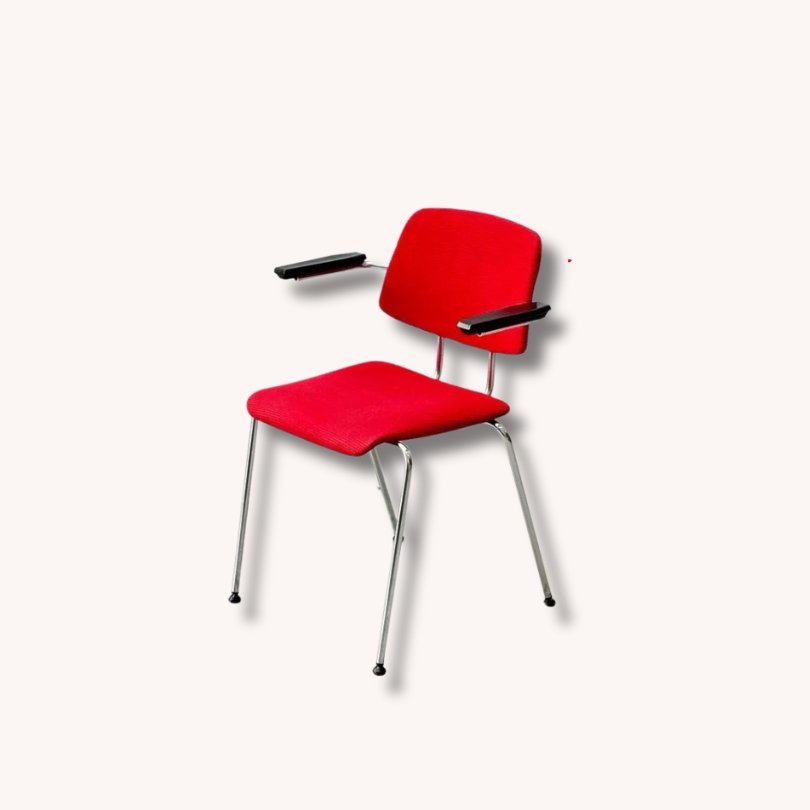 Zustand: Der Stuhl befindet sich insgesamt in gutem gebrauchten Zustand. Die Polsterung ist straff, der Stoff zeigt nur minimale Abnutzungsspuren, insbesondere an den Kanten. Das Chromgestell ist glänzend mit kleineren altersbedingten Kratzspuren. Die Kunststoffarmlehnen sind vollständig und stabil befestigt. Ein originales Vintage-Stück mit funktionalem Charakter und ästhetischer Klarheit.