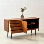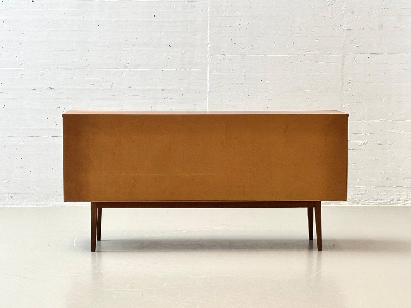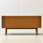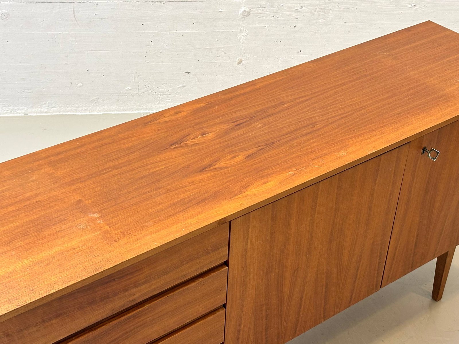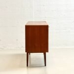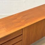 Die rechte Seite ist mit zwei flächenbündigen Türen ausgestattet, hinter denen sich ein grosszügiger Stauraum mit durchgehendem Einlegeboden befindet. Die feine Maserung des Teakholzes, die warmen Farbtöne sowie die reduzierten, präzise gearbeiteten Details unterstreichen die hochwertige Verarbeitung. Schlanke, konisch zulaufende Beine verleihen dem Sideboard eine elegante Leichtigkeit und typische Mid-Century-Anmutung.