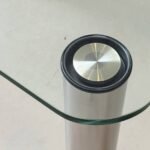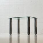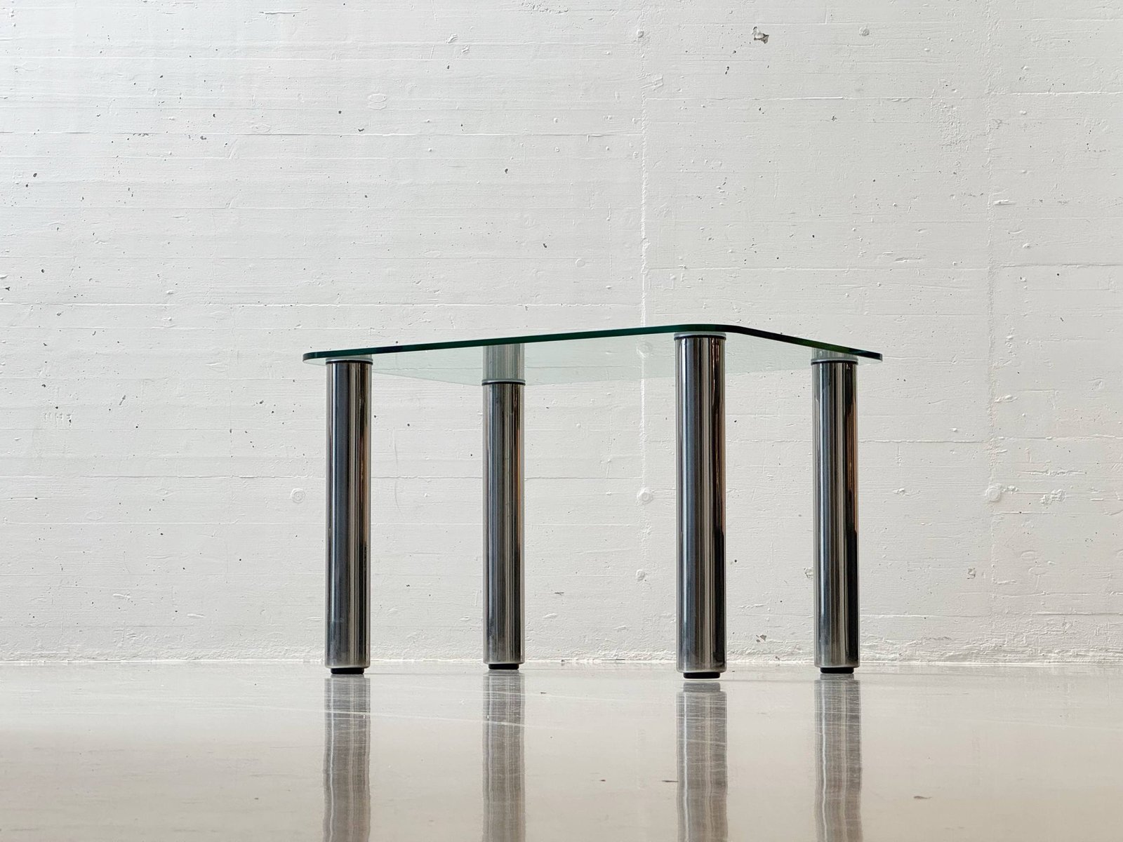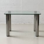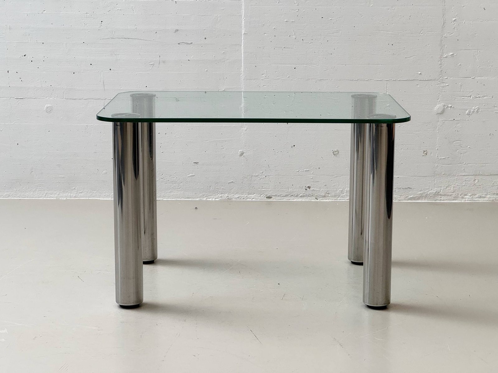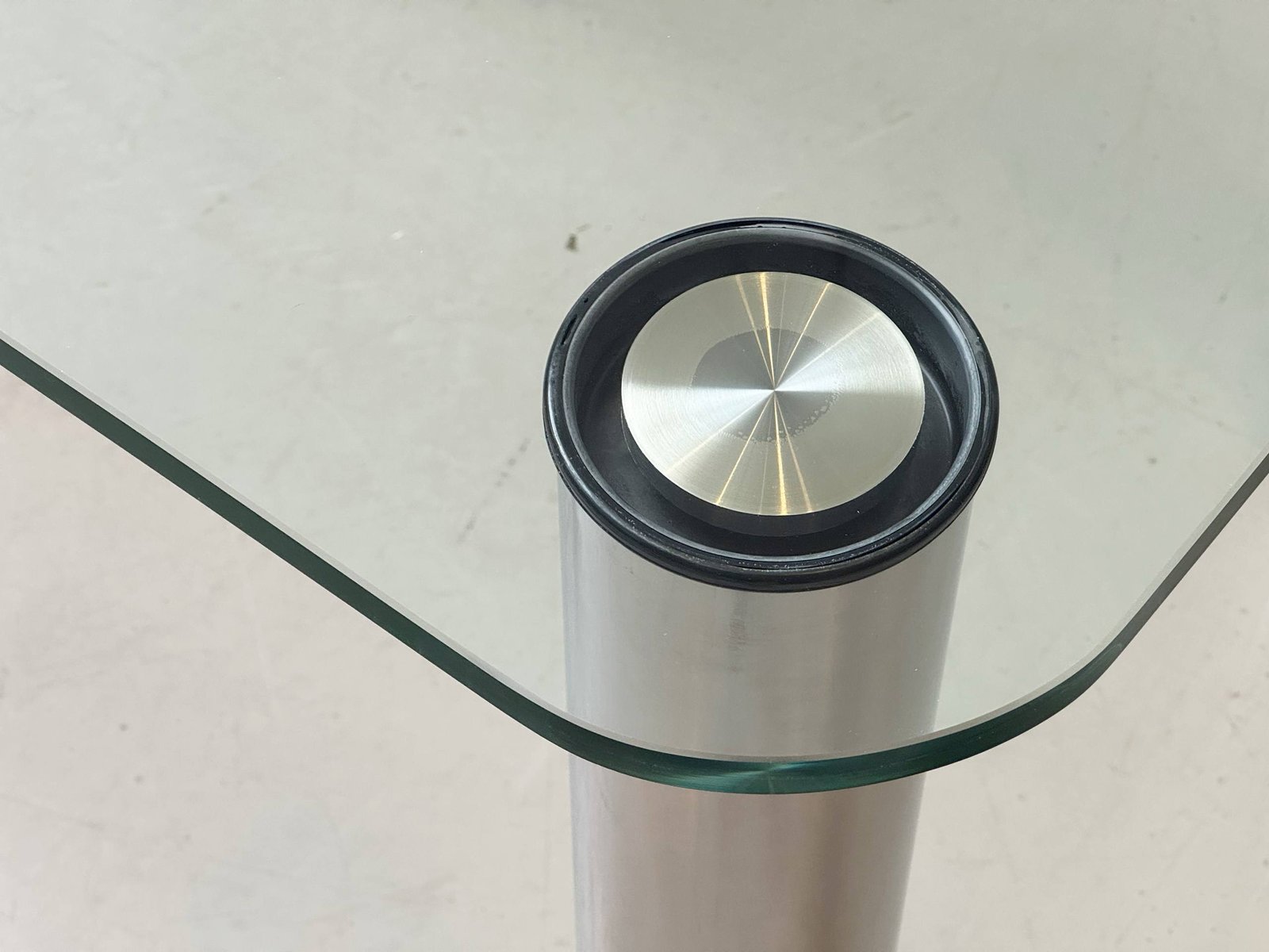 Zustand: Guter Vintage-Zustand mit altersbedingten Gebrauchsspuren. Leichte Kratzer und minimale Kantenbeschädigungen an der Glasplatte sowie feine Gebrauchsspuren an den Edelstahlbeinen. Insgesamt stabil, sauber und voll funktionstüchtig.