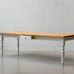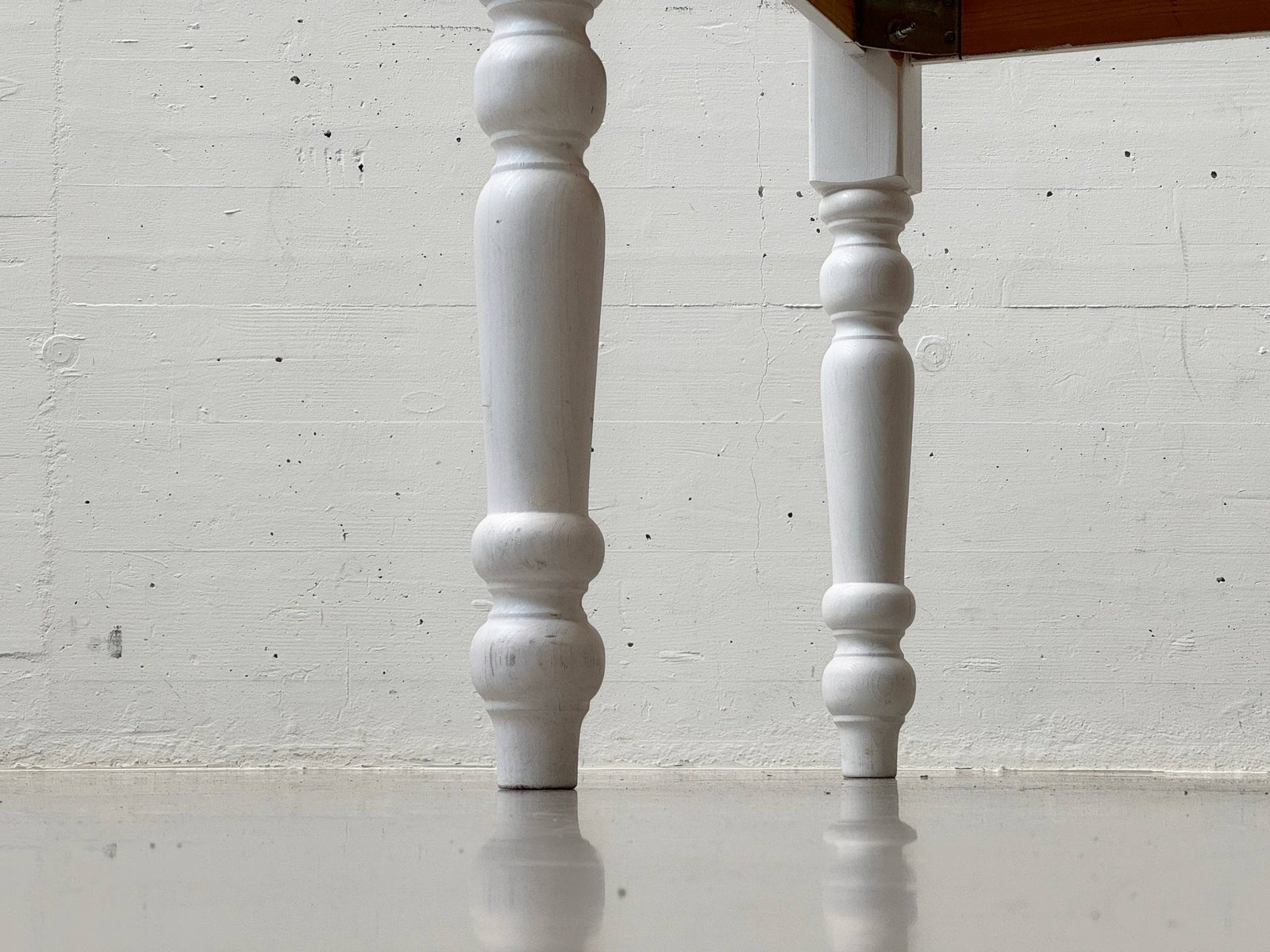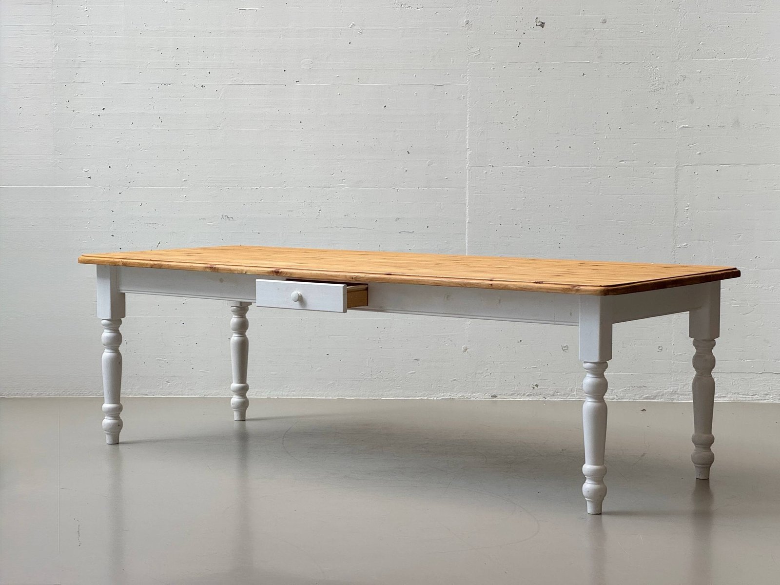 Grosszügiger Esstisch im klassischen Landhausstil mit charmanter, handwerklicher Ausstrahlung. Der weiss gefasste Korpus mit gedrechselten Beinen verleiht dem Tisch eine traditionelle, warme Präsenz, während die massive Holzplatte einen schönen Kontrast setzt und den rustikalen Charakter unterstreicht. Die Tischplatte wurde kürzlich frisch abgeschliffen und zeigt sich in einem besonders sauberen und natürlichen Zustand. Die lebendige Maserung mit sichtbaren Aststellen verleiht dem Tisch Authentizität und macht jedes Stück Holz einzigartig. Eine integrierte Schublade bietet zusätzlichen praktischen Stauraum und passt sich harmonisch in das Gesamtbild ein. Mit seiner grosszügigen Länge eignet sich der Tisch ideal als Esstisch für mehrere Personen, als Arbeitstisch oder auch als Statement-Piece in einem modernen Interieur mit bewusst gesetztem Stilbruch zwischen Alt und Neu.