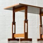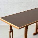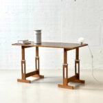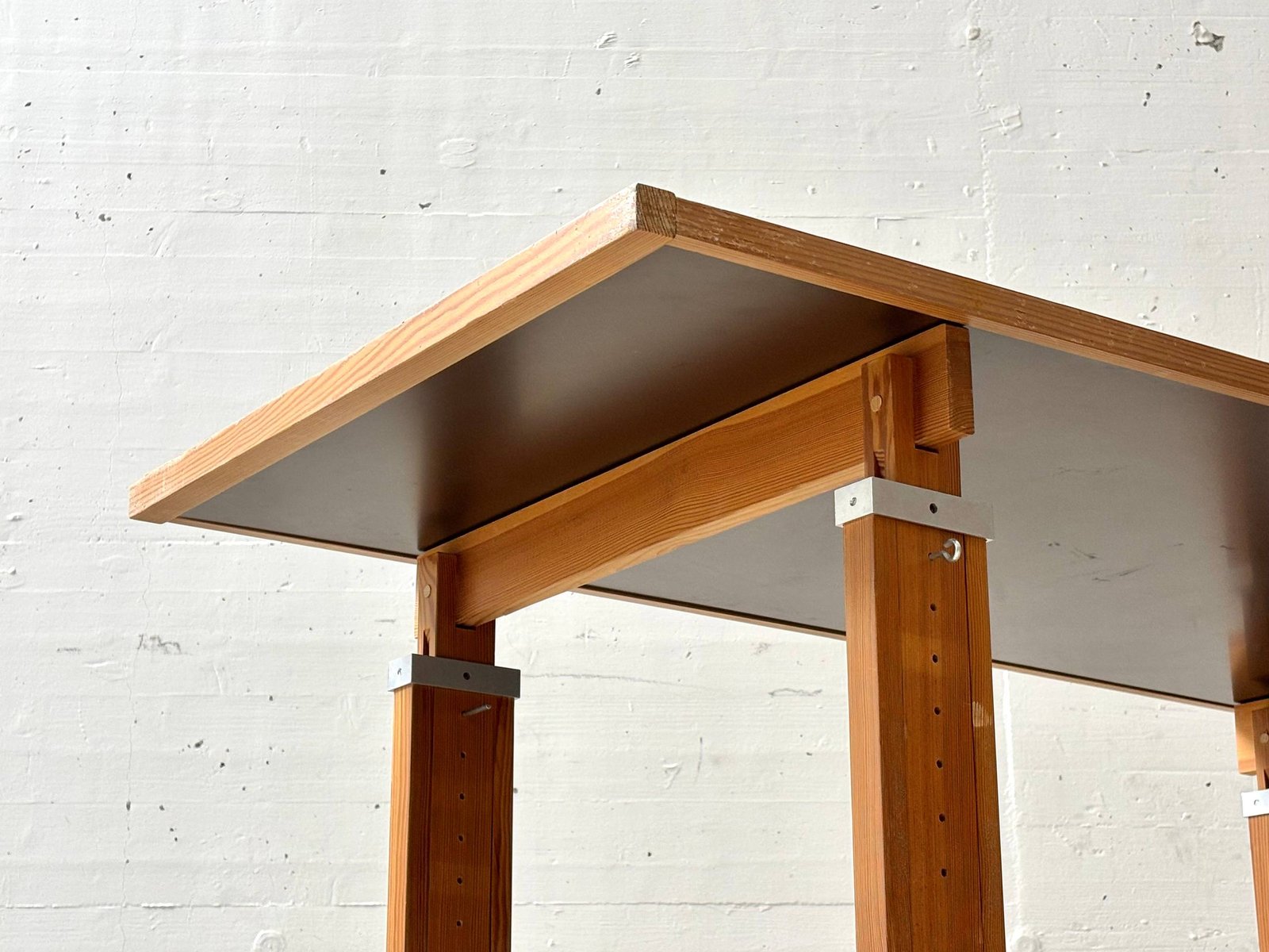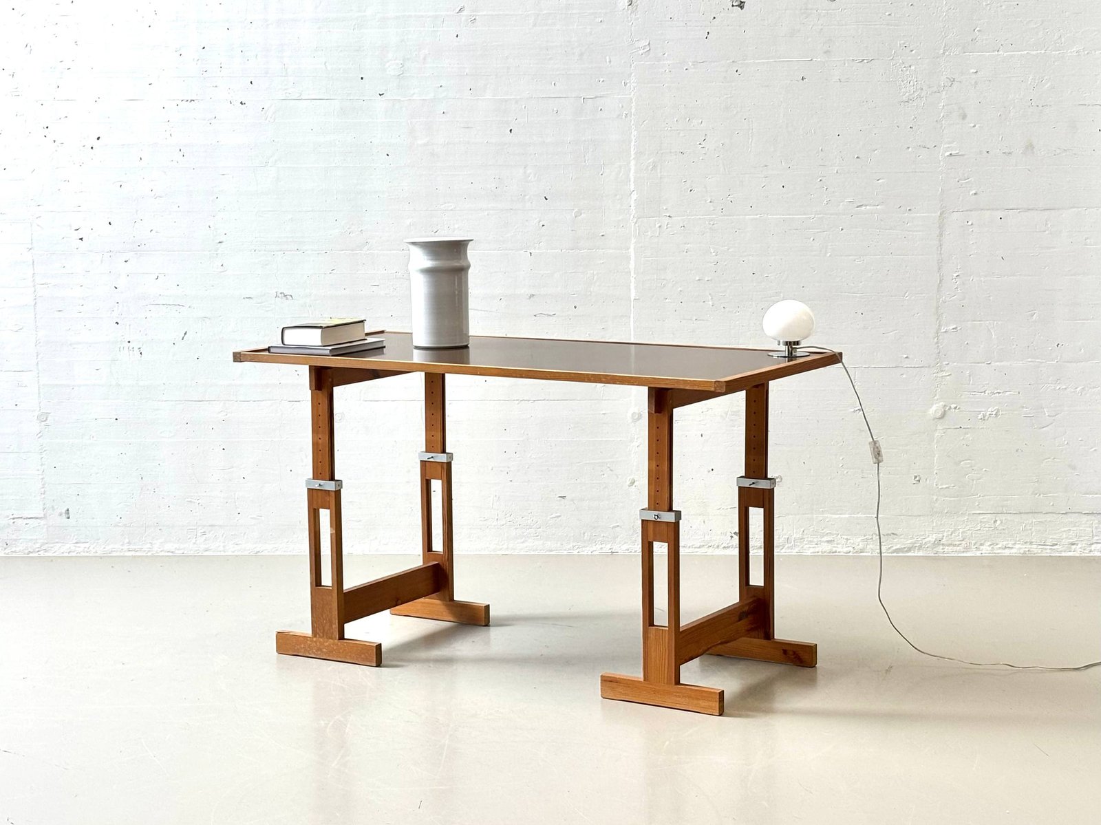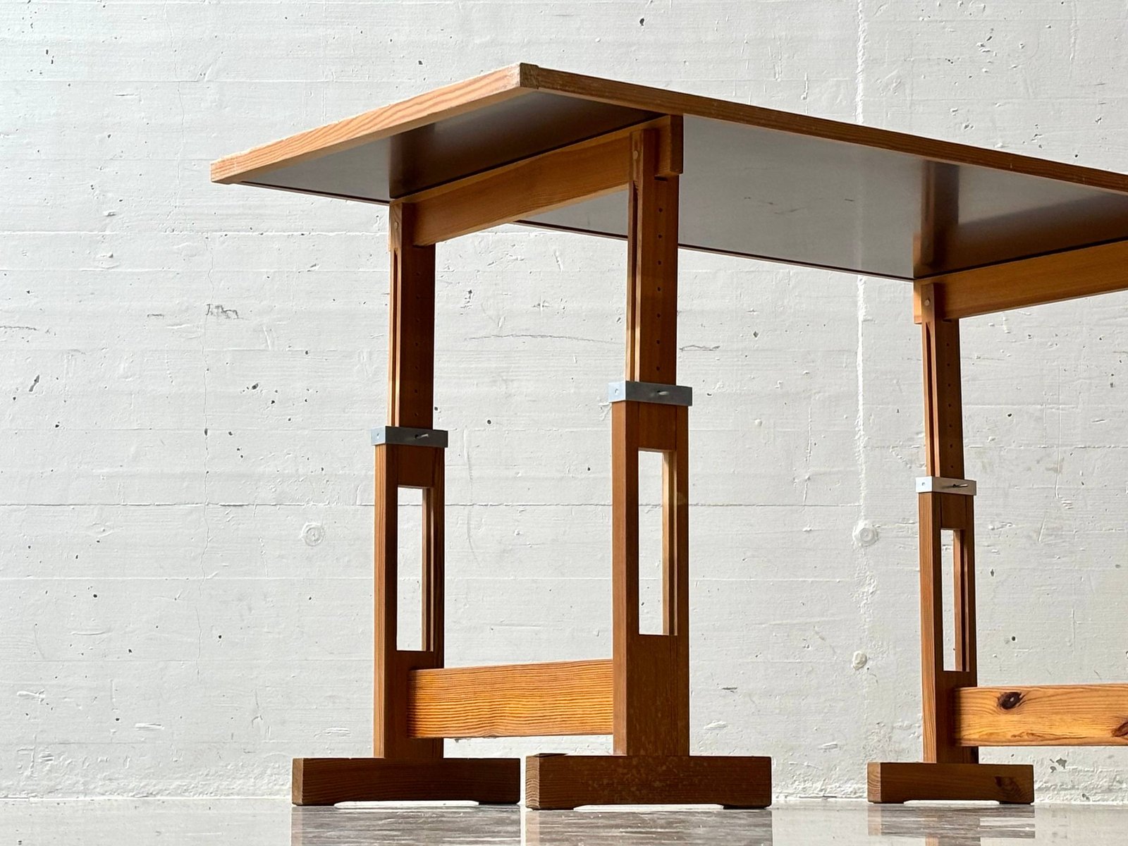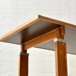 Markanter Vintage-Arbeitstisch mit klarer, funktionaler Formsprache der 1960er–70er Jahre. Die Kombination aus massivem Holzgestell und dunkler Arbeitsplatte verleiht dem Stück eine starke Präsenz – reduziert, ehrlich und absolut zeitlos. Charakteristisch ist das höhenverstellbare Gestell: Über ein durchdachtes System aus Lochleisten und Metallbolzen lässt sich die Arbeitshöhe flexibel anpassen – vom klassischen Schreibtisch bis hin zum Stehpult oder Zeichentisch. Die Konstruktion wirkt technisch und zugleich warm durch das massive Holz. Die Tischplatte mit dunkler Oberfläche ist robust und pflegeleicht, eingefasst von einer massiven Holzkante, die das Gesamtbild sauber rahmt und schützt. Stilistisch bewegt sich der Tisch im Spannungsfeld von funktionalem Modernismus und brutalistischer Klarheit.