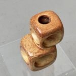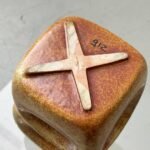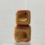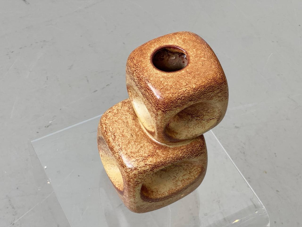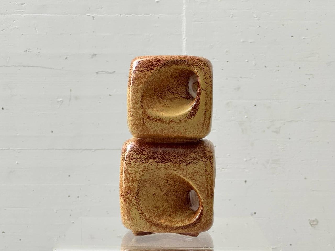 Markante Keramikarbeit des italienischen Herstellers Bertoncello aus den 1970er Jahren. Die skulpturale Form besteht aus zwei übereinandergesetzten Kubuselementen mit weich gerundeten Kanten und tief ausgearbeiteten, kreisförmigen Vertiefungen auf den Seitenflächen.