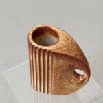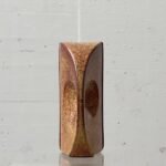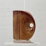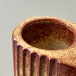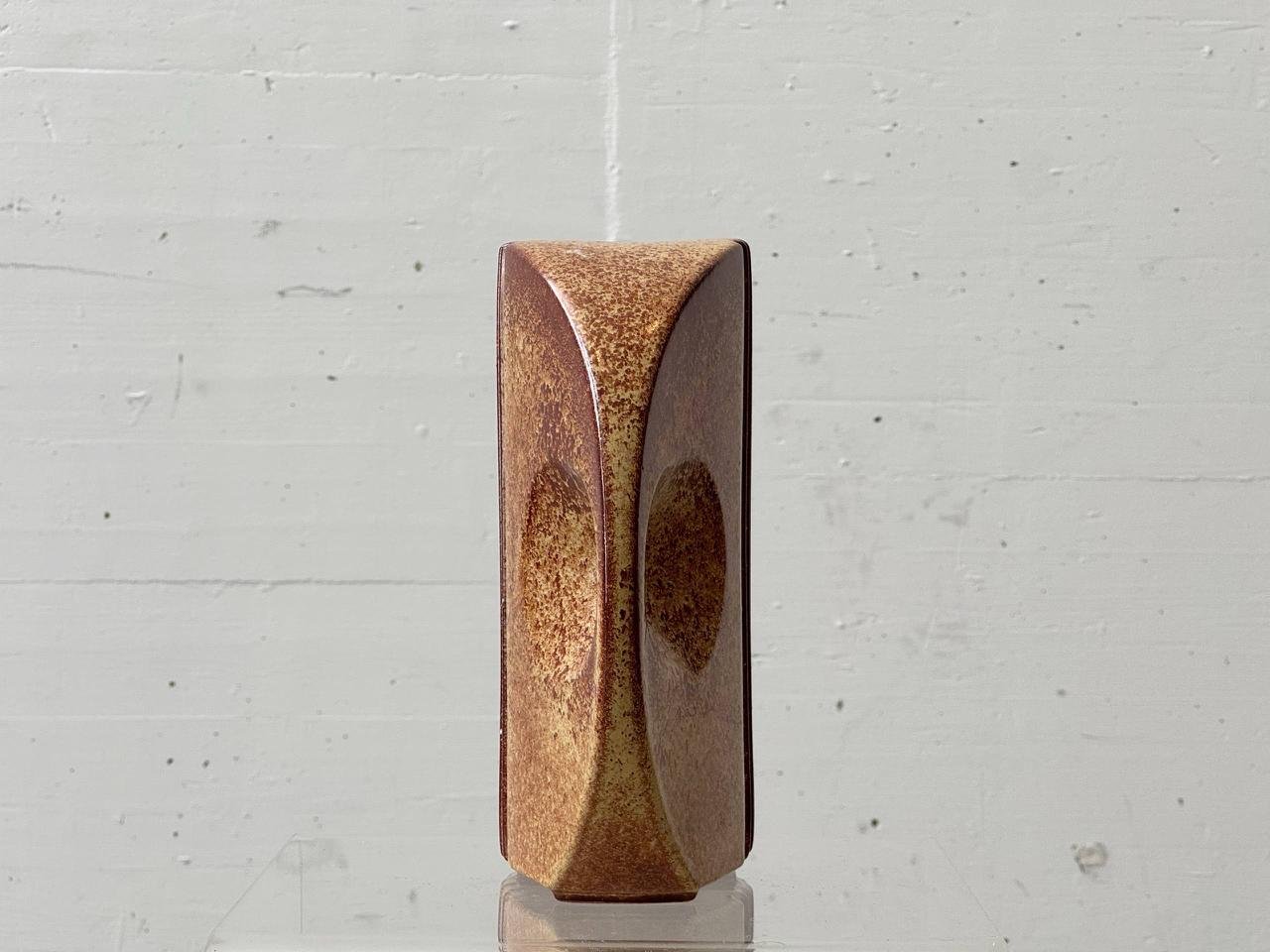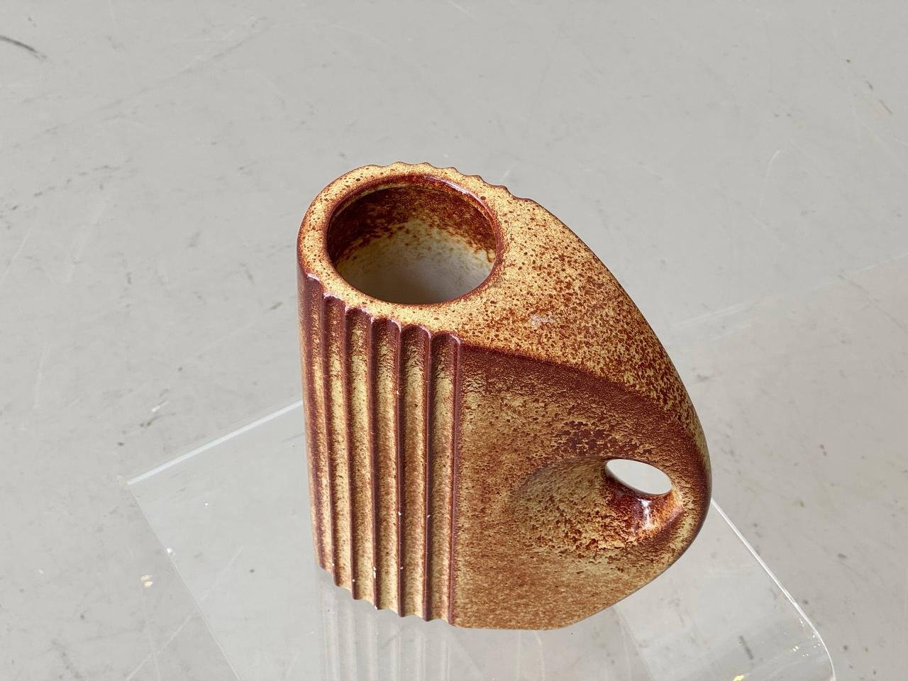 Skulpturale Keramikvase von Bertoncello aus den 1970er Jahren mit charakteristischer halbkreisförmiger Silhouette. Die Vorderseite ist mit vertikalen Rillen strukturiert, während die seitliche Öffnung und die sanft geschwungene Rückseite eine dynamische, fast architektonische Form erzeugen. Die warme, nuancierte Glasur in Braun- und Ockertönen mit feiner Sprenkelung unterstreicht die plastische Gestaltung und verleiht dem Objekt eine hochwertige, handwerkliche Anmutung. Ein typisches Beispiel für die experimentelle Formensprache der italienischen Keramik dieser Zeit.