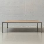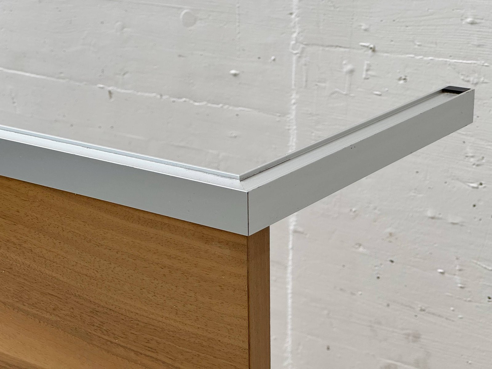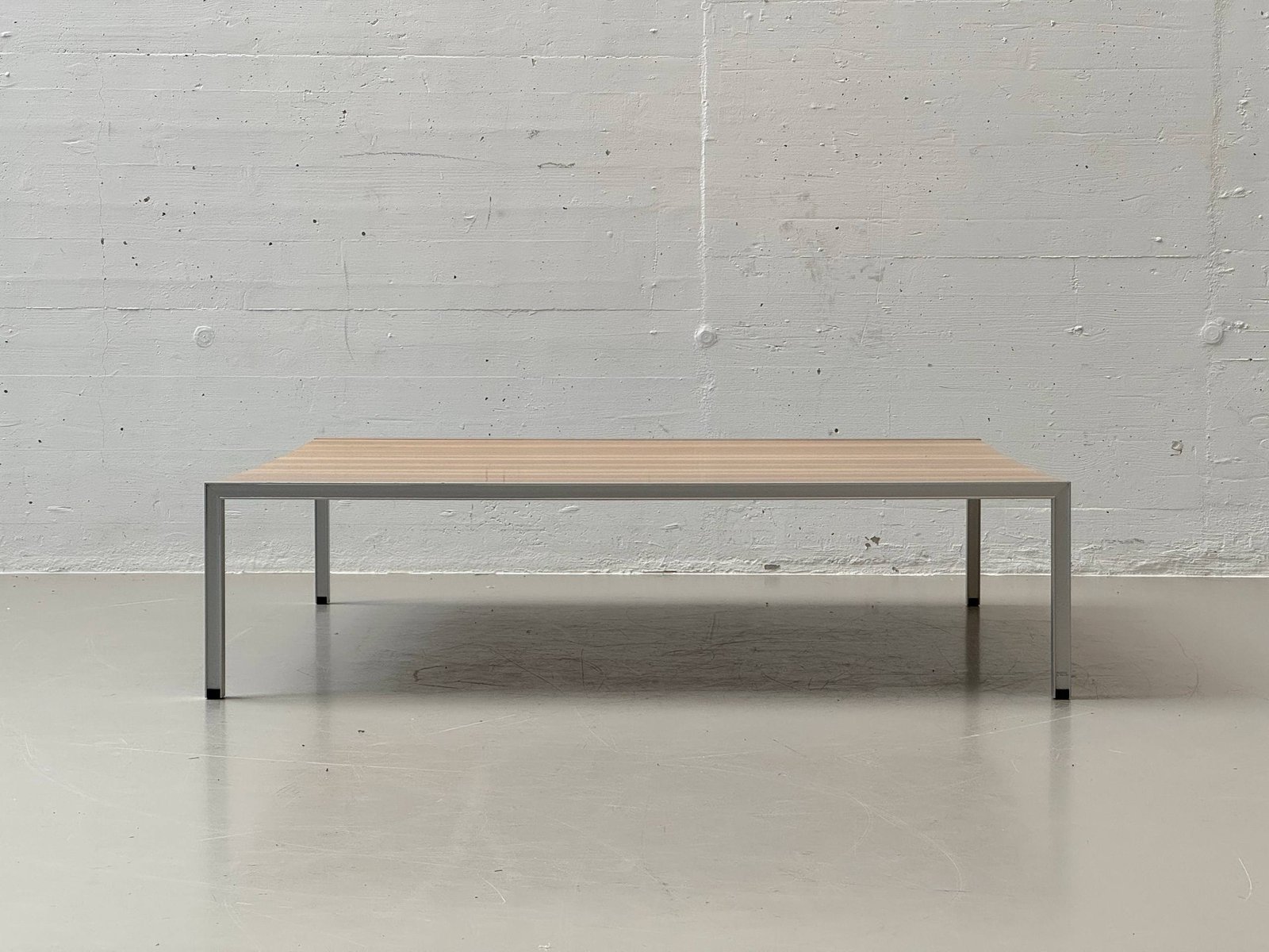 Niedriger Couchtisch von ROOM by wellis aus der frühen 2000er Jahren mit klarer, architektonischer Formensprache. Die rechteckige Tischplatte ist mit einem hochwertigem Nussbaumfurnier ausgeführt, dessen lebendige, streifige Maserung einen warmen Kontrast zur kühlen Metallkonstruktion bildet. Die Platte liegt präzise in einem umlaufenden Aluminiumrahmen, der an den Ecken sauber auf Gehrung gearbeitet ist und dem Entwurf eine technisch klare Kontur verleiht. Das filigrane Untergestell besteht aus schlanken, rechtwinkligen Aluminiumprofilen, welche die Platte leicht vom Boden abheben und dem Tisch eine schwebende Wirkung geben. Die reduzierte Konstruktion lässt das Material und die Proportionen für sich sprechen und macht den Tisch vielseitig einsetzbar – als Couchtisch, niedriger Beistelltisch oder Solitär in modernen Wohn- und Arbeitsumgebungen. Eine Prägung am Metallrahmen bestätigt die Herkunft von ROOM by wellis.