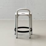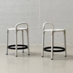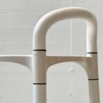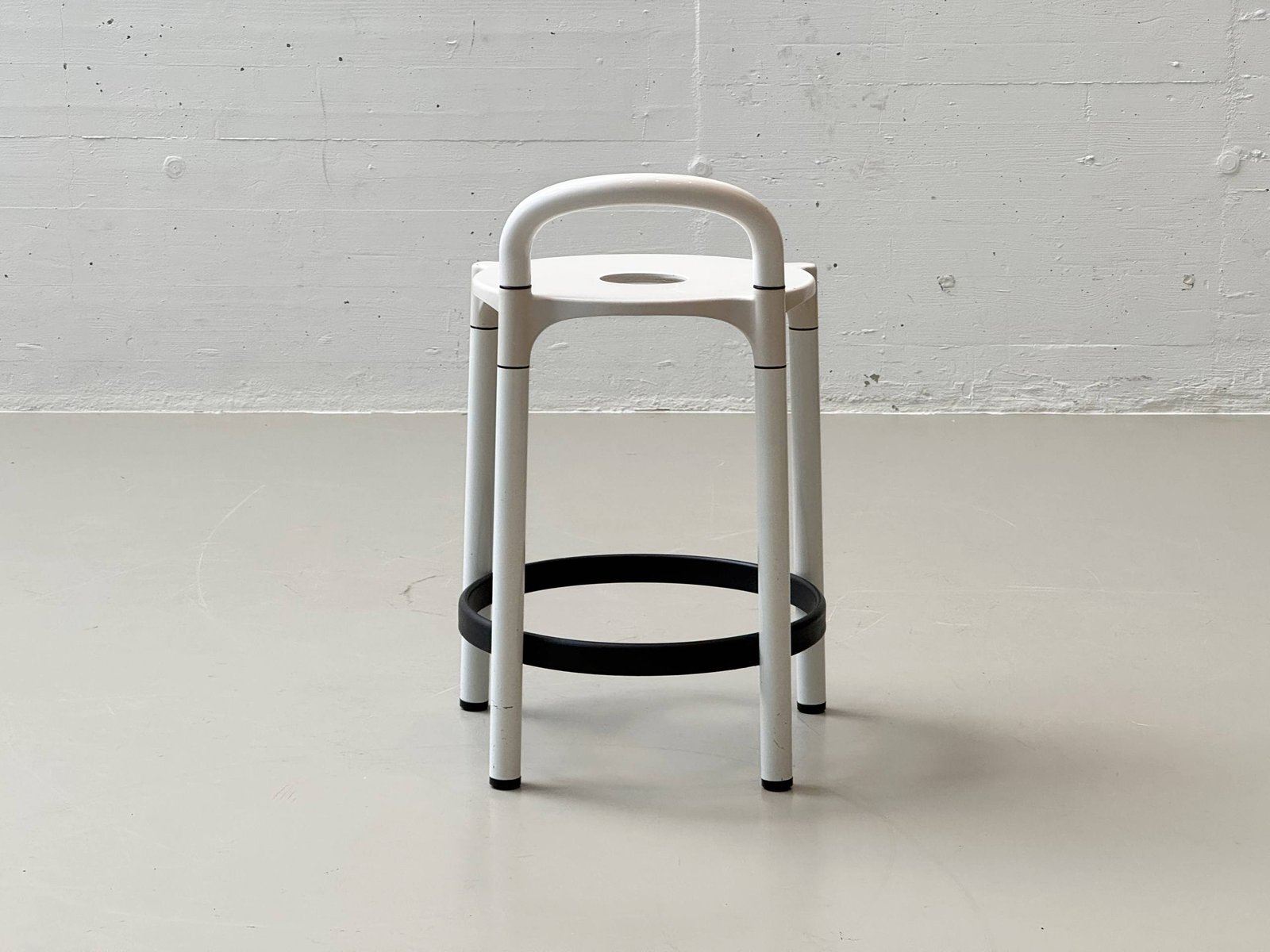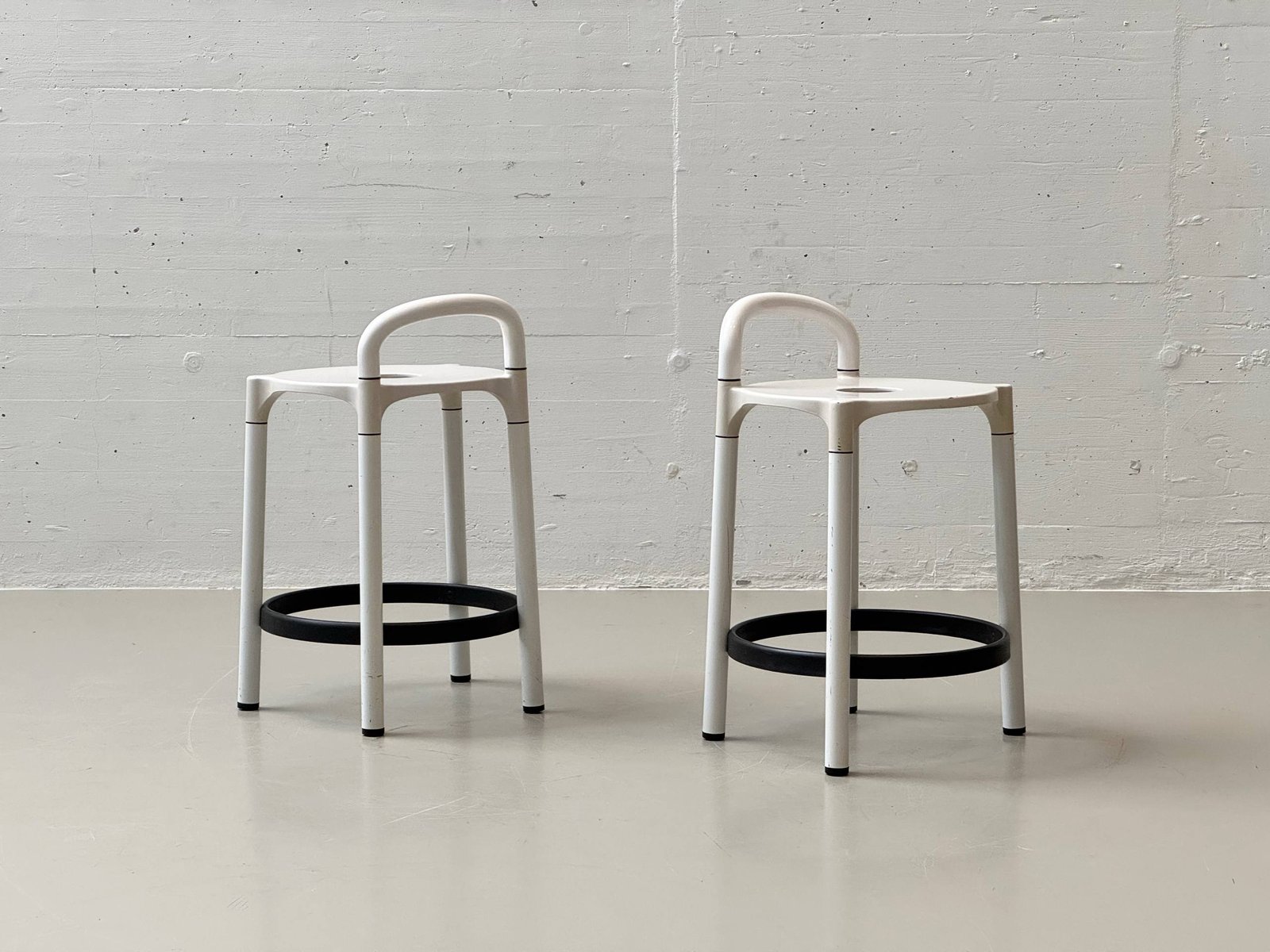 Ikonisches Hockerpaar des italienischen Herstellers Kartell, entworfen von Anna Castelli Ferrieri in den 1960er Jahren. Charakteristisch ist die klar reduzierte Formensprache mit rundem Sitz mit zentraler Öffnung sowie integrierter Griffpartie. Die Konstruktion kombiniert weiss lackierte Metallbeine mit schwarzem Ringfuss und steht exemplarisch für das funktionale, industrienahe Design jener Zeit. Die Hocker wirken leicht, graphisch präzise und zugleich robust – typisch für Kartells experimentellen Umgang mit neuen Materialien und modularen Konstruktionen. Ideal als Barhocker, Atelierhocker oder als skulpturales Statement in reduzierten Interieurs.