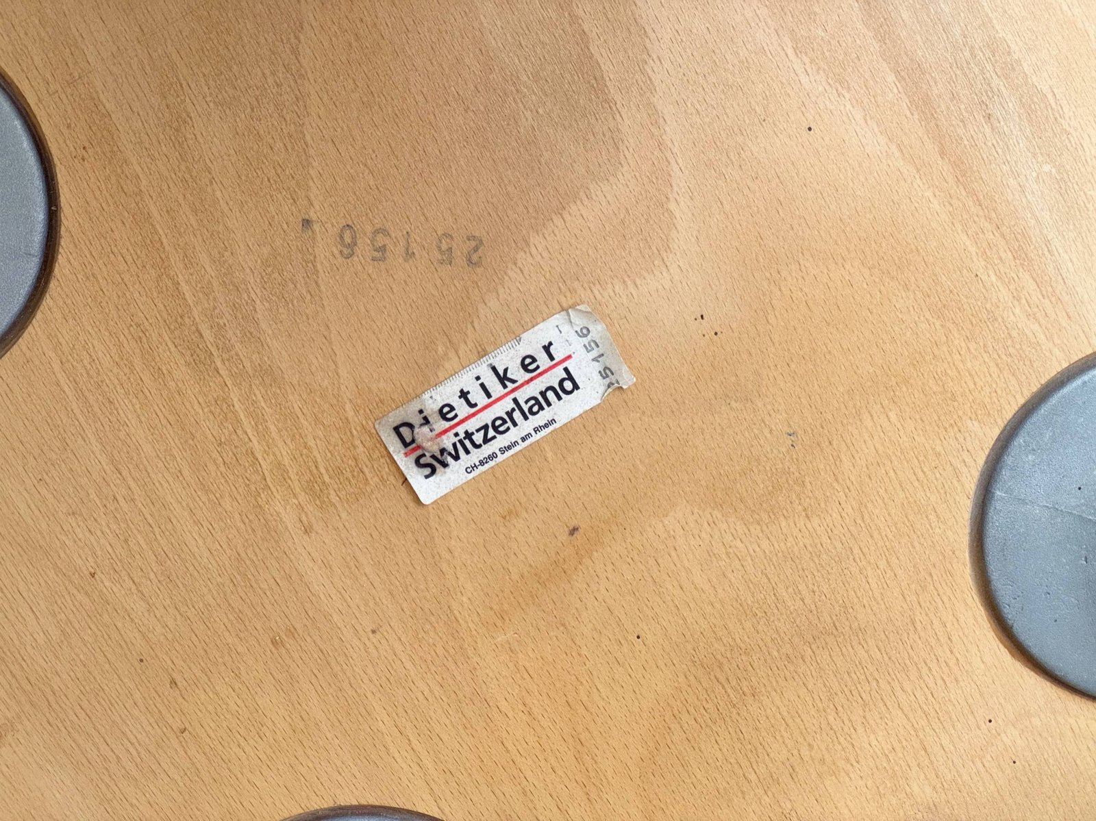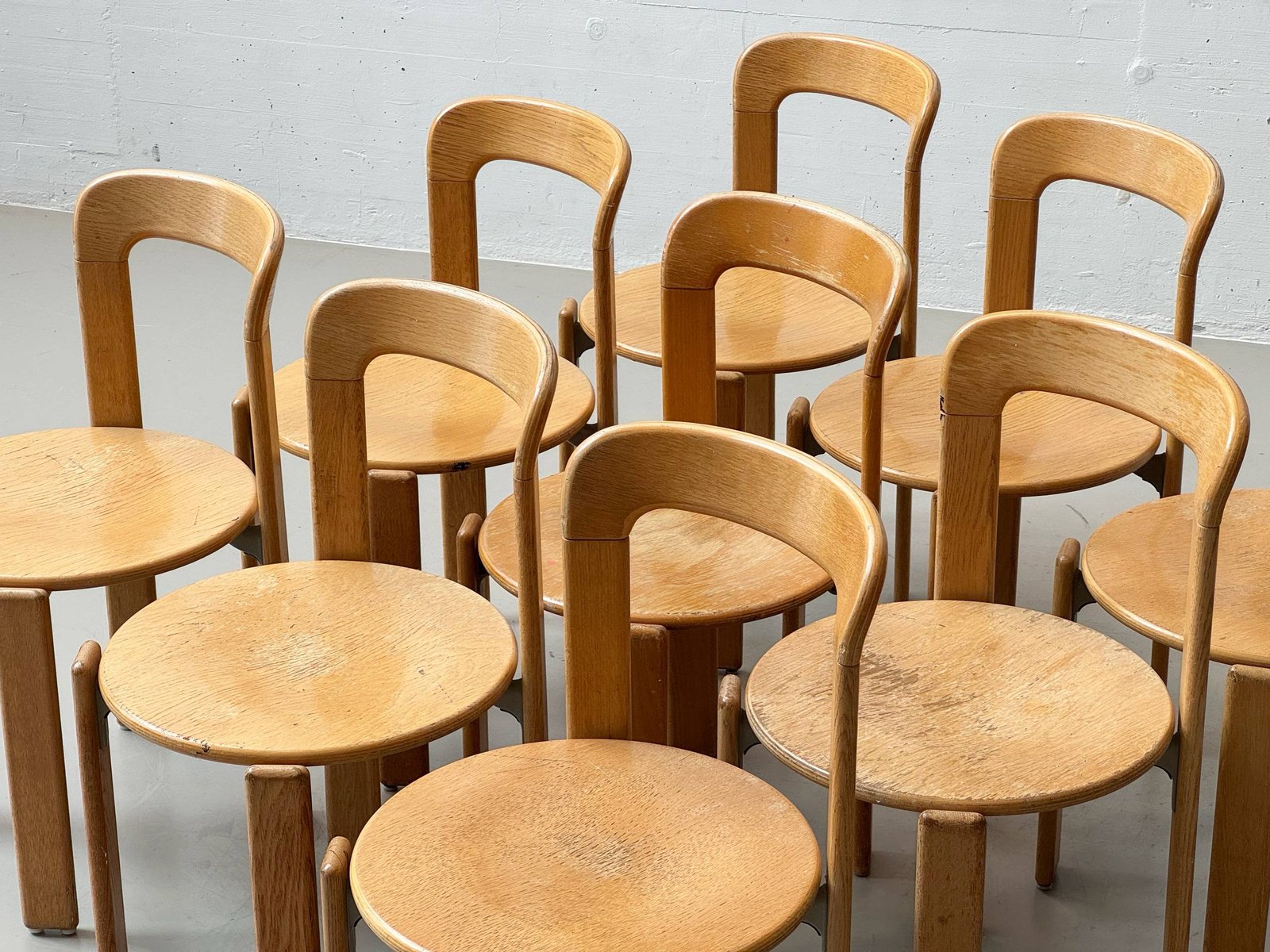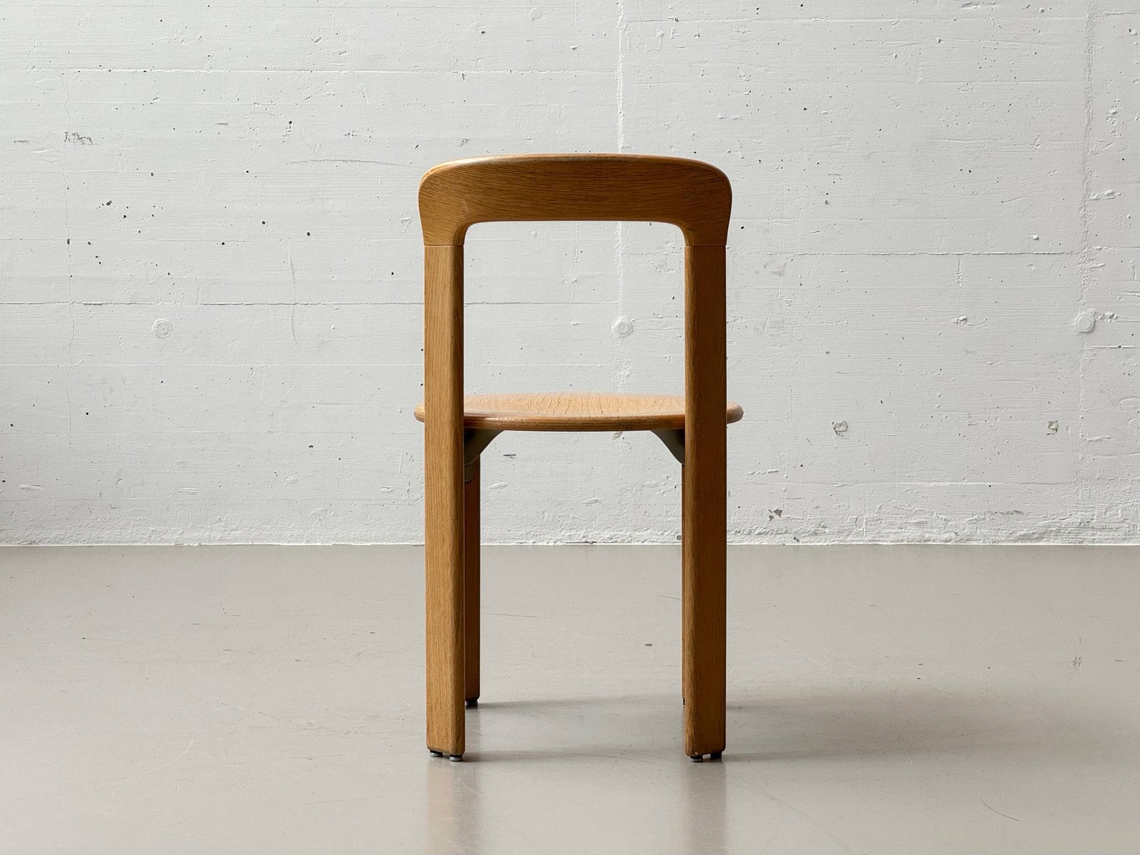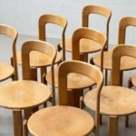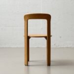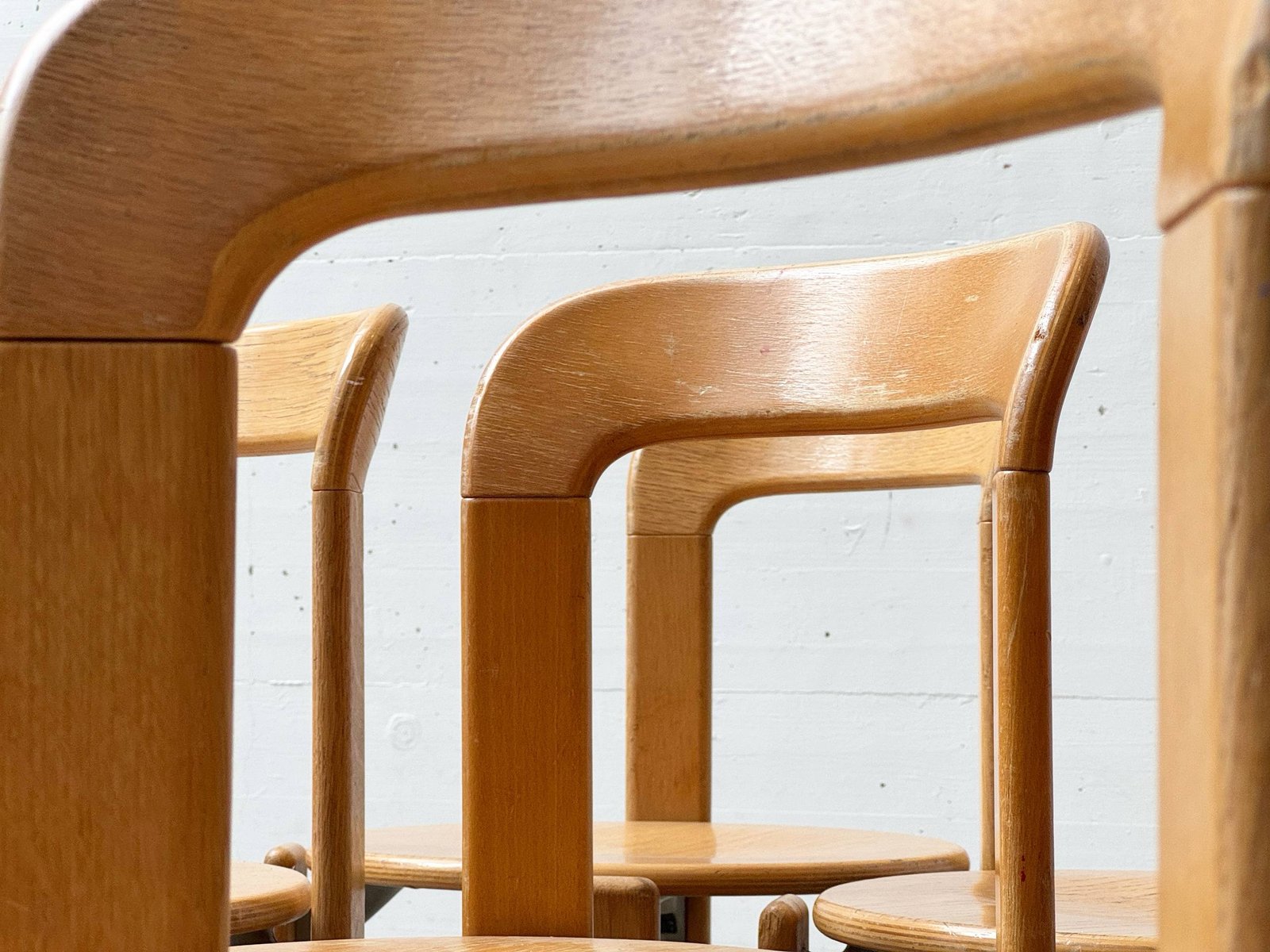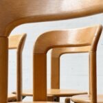 Die Stühle bestehen aus massivem Buchenholz (typisch für Dietiker) und zeigen die warme, honigfarbene Patina, die sich über Jahrzehnte entwickelt hat. Die runde Sitzfläche sowie die fliessend geformte Rückenlehne sorgen für eine angenehme Ergonomie und machen das Modell sowohl im privaten Wohnbereich als auch im Objektbereich einsetzbar.