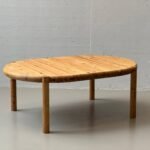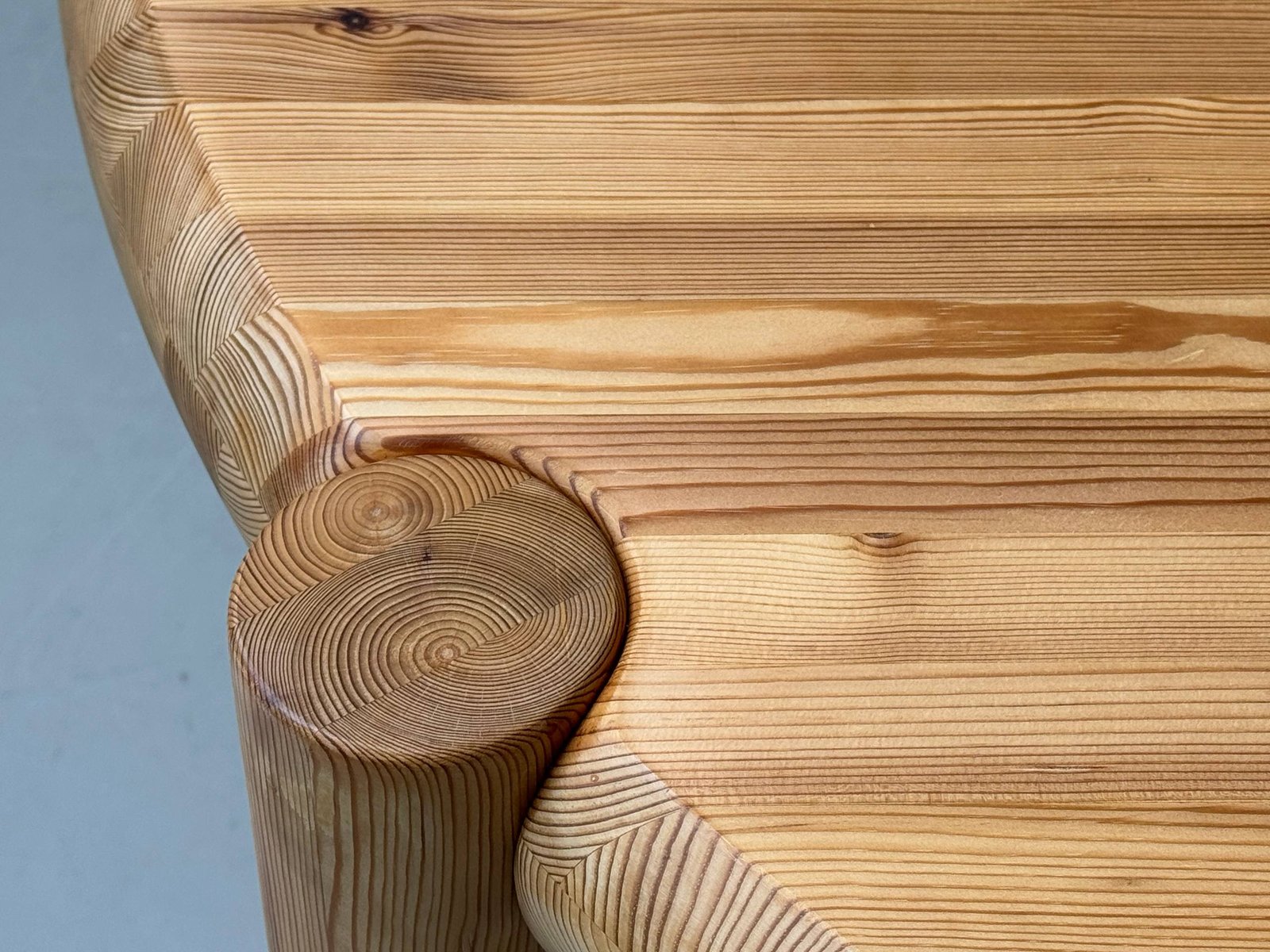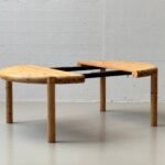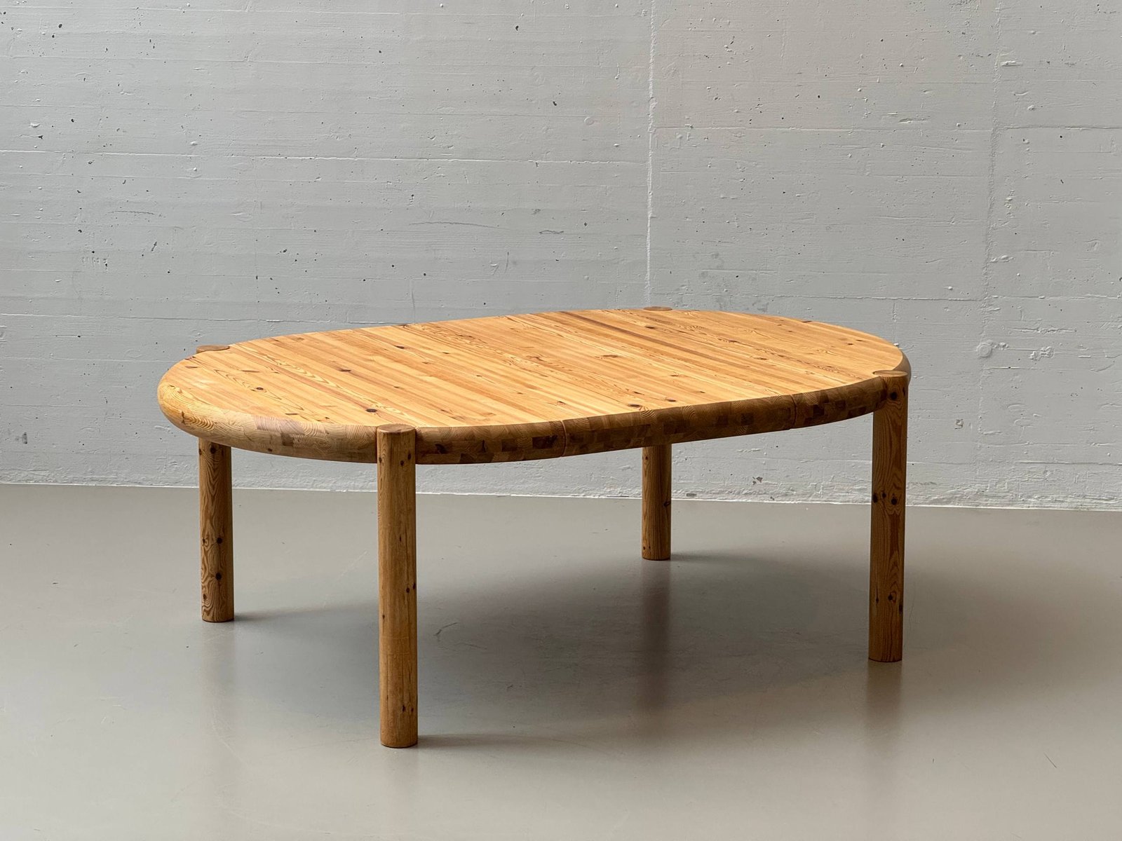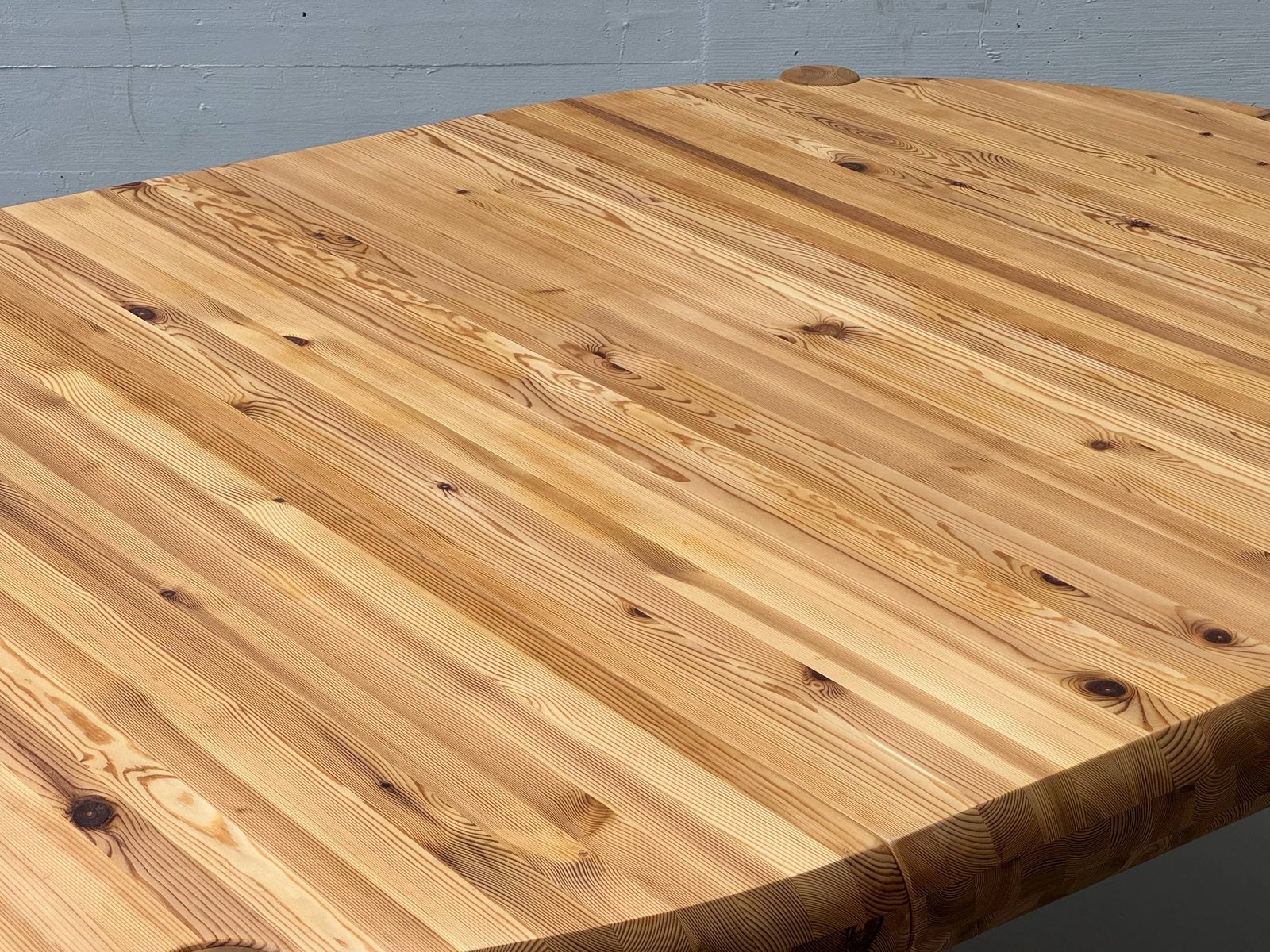 Robuster, ausziehbarer Esstisch aus massiver Kiefer, entworfen von Rainer Daumiller in den 1970er Jahren. Der Tisch überzeugt durch seine klare, funktionale Formensprache: In geschlossenem Zustand präsentiert er sich mit runder Tischplatte, erweitert mit einer Einlegeplatte entsteht eine harmonische ovale Form. Die kräftigen, zylindrischen Beine unterstreichen den rustikalen Charakter und stehen in stimmigem Dialog mit dem ehrlichen Material. Ein archetypisches Beispiel skandinavischen Designs, das Funktionalität, Stabilität und zeitlose Ästhetik vereint.