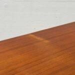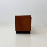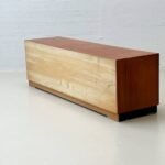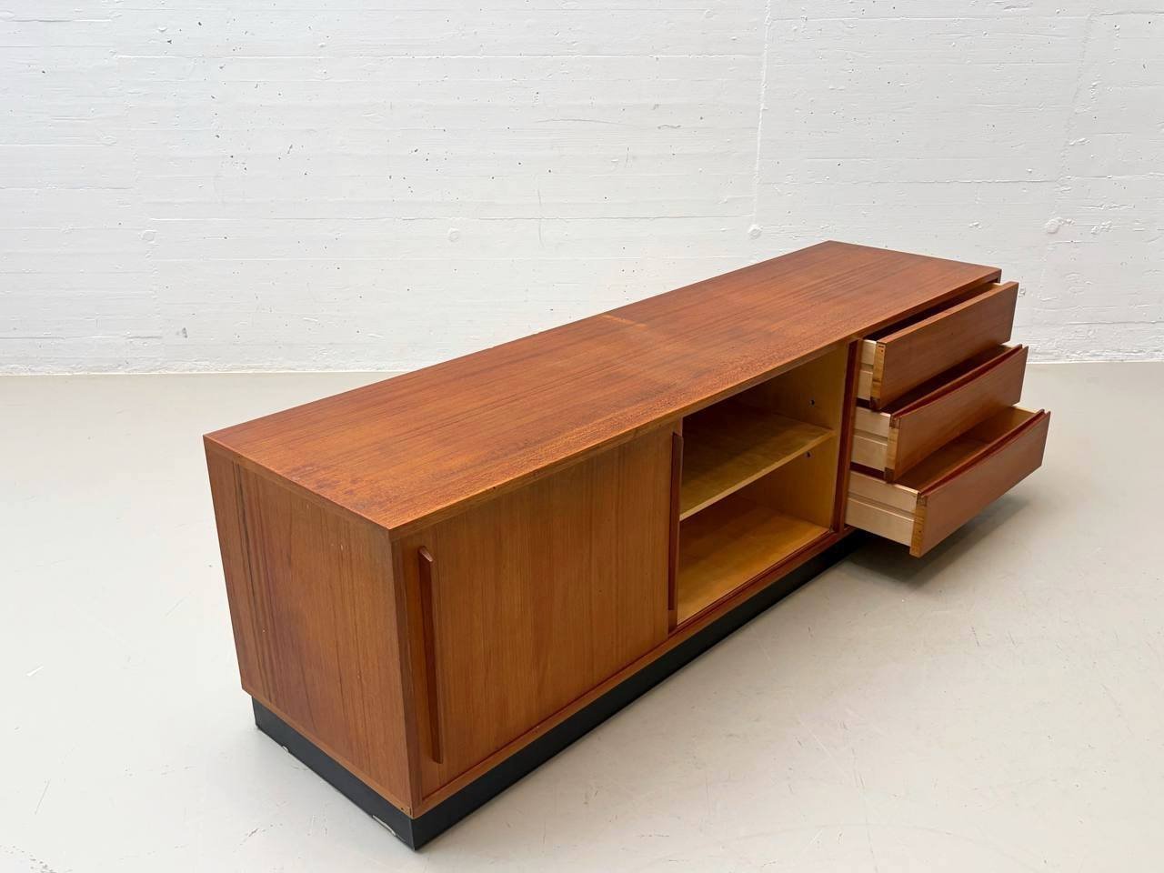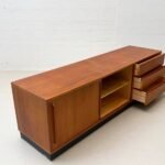 Elegantes Sideboard aus furniertem Teakholz, entworfen vom Schweizer Designer Dieter Wäckerlin. Die klare, horizontal betonte Gestaltung steht exemplarisch für die sachliche Schweizer Moderne der 1960er Jahre. Das Möbel verfügt über zwei Schiebetüren mit dahinterliegendem Innenregal sowie drei grosszügige Schubladen auf der rechten Seite. Das helle Innenleben aus Ahornholz bildet einen hochwertigen und bewusst eingesetzten Kontrast zum warmen Teakton der Aussenflächen. Der Korpus ruht auf einem zurückversetzten Holzsockel mit schwarzer Einfassung, der dem Sideboard eine schwebende, architektonische Wirkung verleiht.
