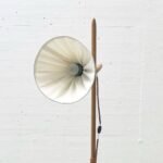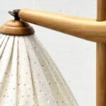 Die Lichtquelle strahlt weich und nach unten gerichtet, ideal für Leseecken oder stimmungsvolle Akzentbeleuchtung. Das Gelenk am Schirm mit kleiner Flügelschraube erlaubt das Ausrichten des Lichtkegels. Charakteristisch ist die dekorative Kabelführung: Das Anschlusskabel wird mit kleinen Holzperlen sauber am Mast entlang gefasst – ein charmantes Detail, das die handwerkliche Prägung unterstreicht.