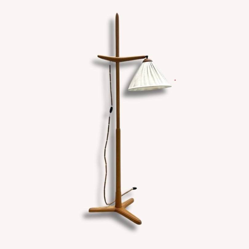 Die Kombination aus Holz-Dreifuss aus Buche, schlankem Holzschaft und seitlichem Holzarm entspricht exakt der Temde-Materialsprache der späten 1950er und 1960er Jahre. Die typische Holzperlen-Huelle auf dem Kabel findet sich bei mehreren dokumentierten Temde-Leuchten, besonders bei Pendelmodellen.